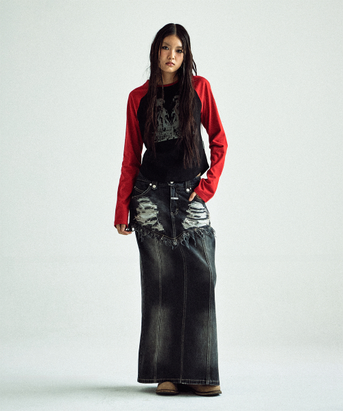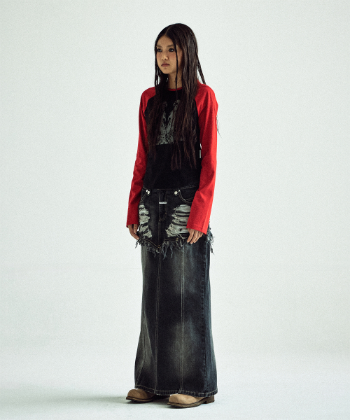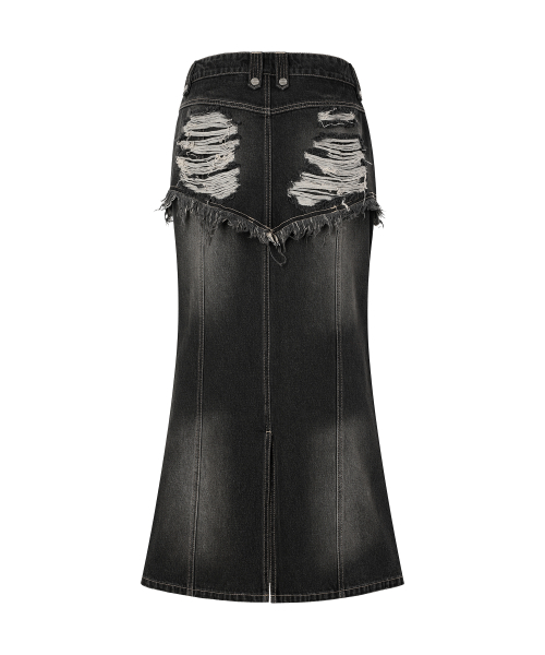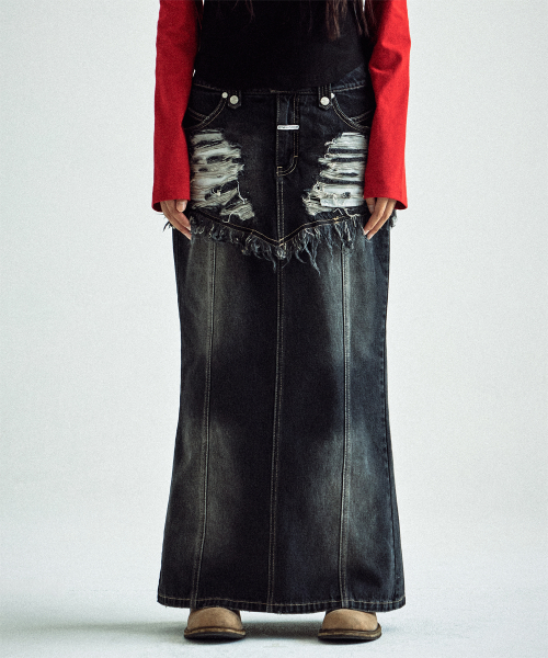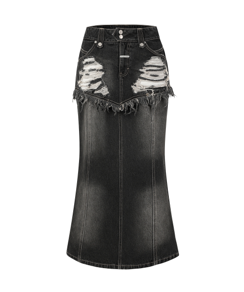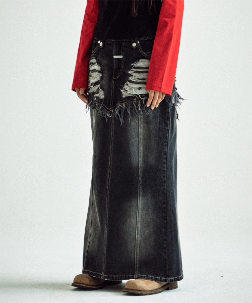 DESTROYED DOUBLE DENIM SKIRT BLACK