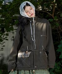 WXJ032 하늘 체크 배색 워싱 코튼 자켓 (KHAKI)