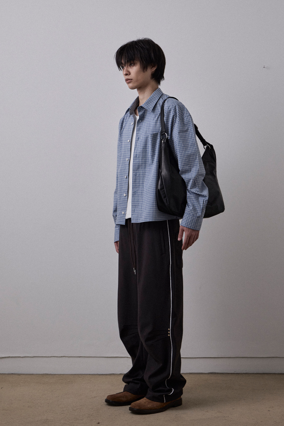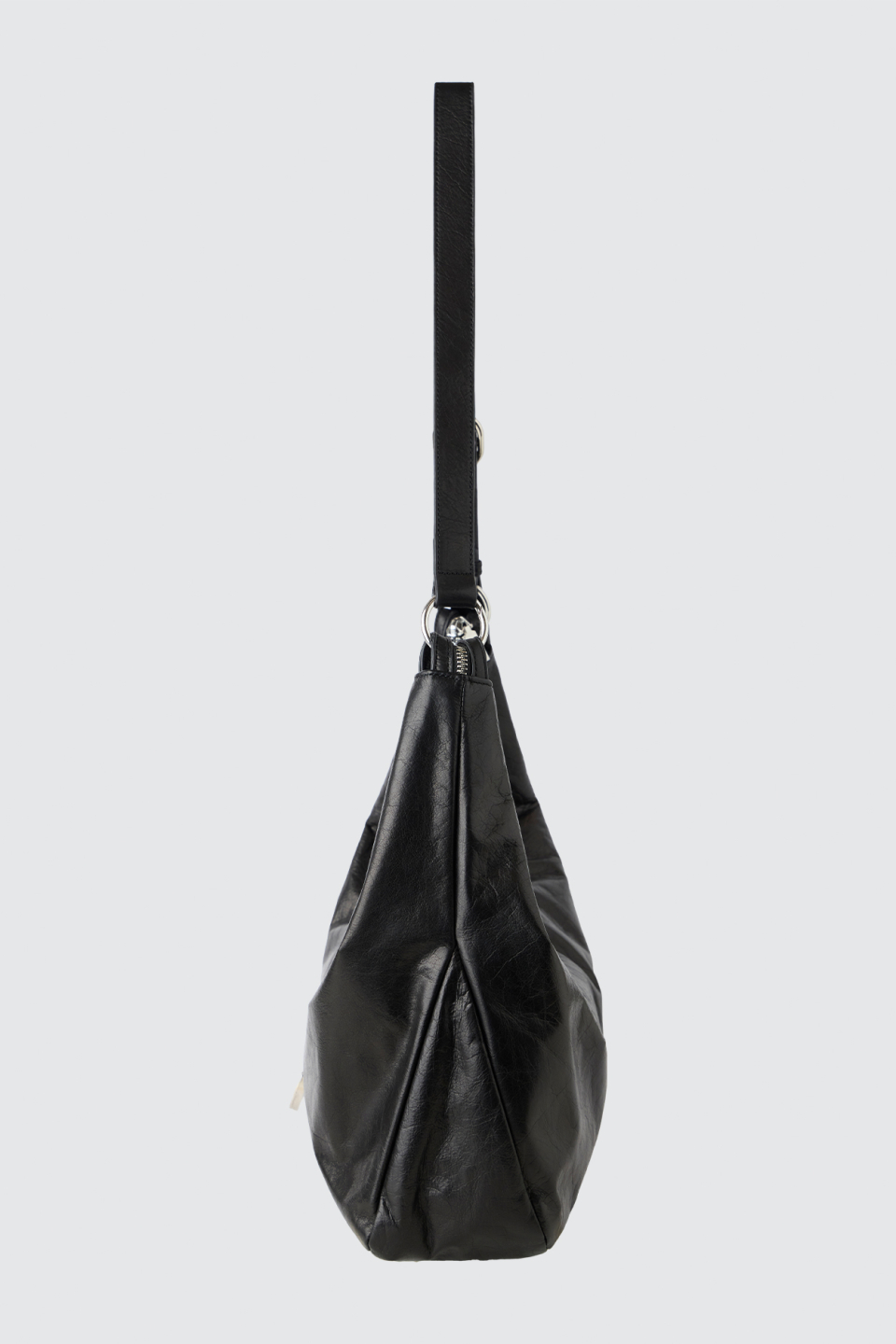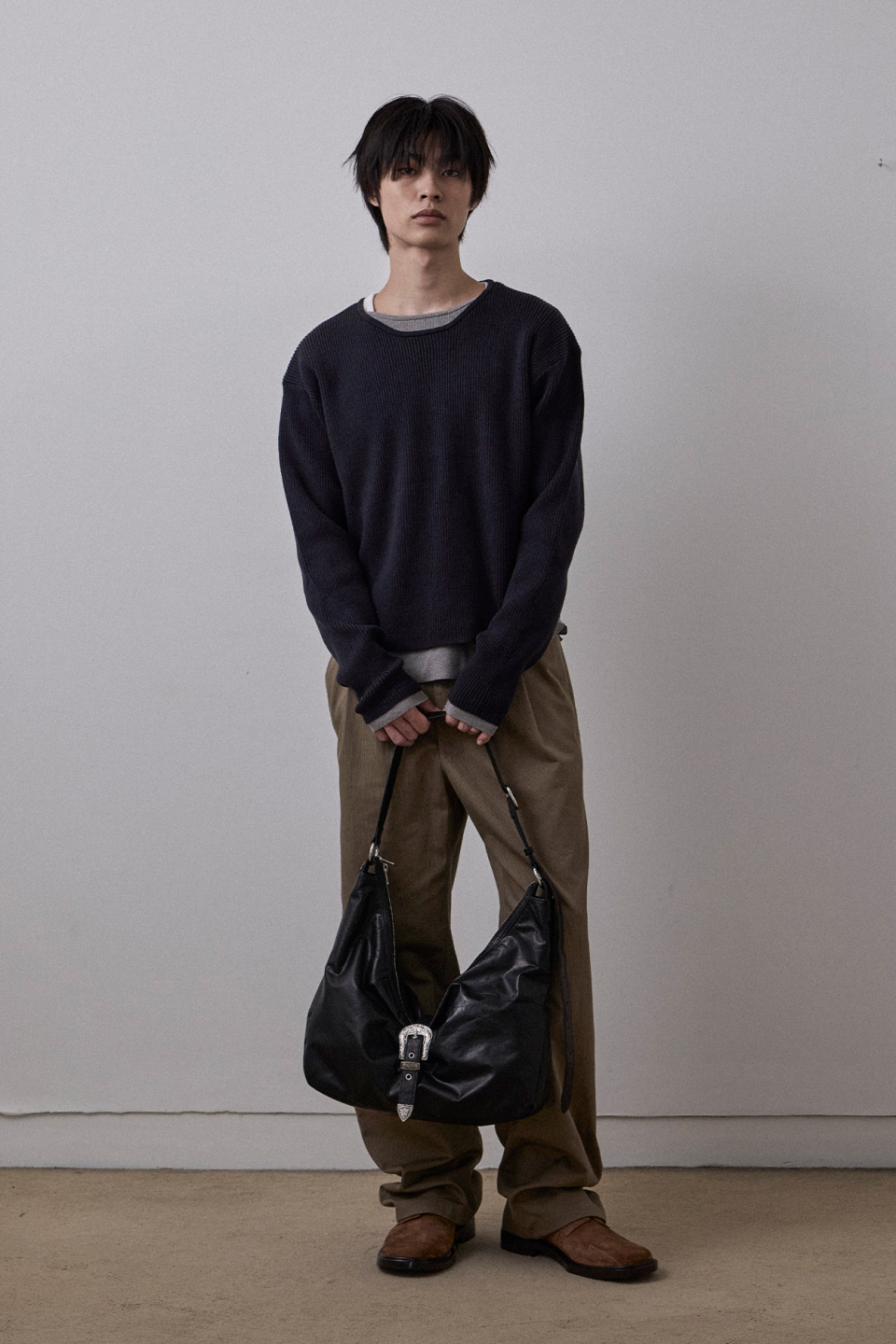 크랙 왁싱 처리된 소가죽 텍스처가 돋보이는 모던한 무드의 숄더백