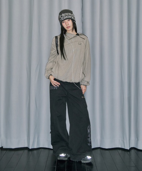 와플 커버 스티치 후드 티셔츠 - CHARCOAL
