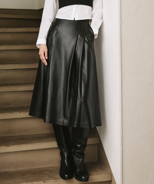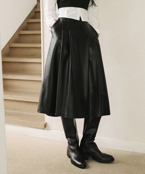 신세틱 소프트 레더 플레어 롱 스커트 [블랙]