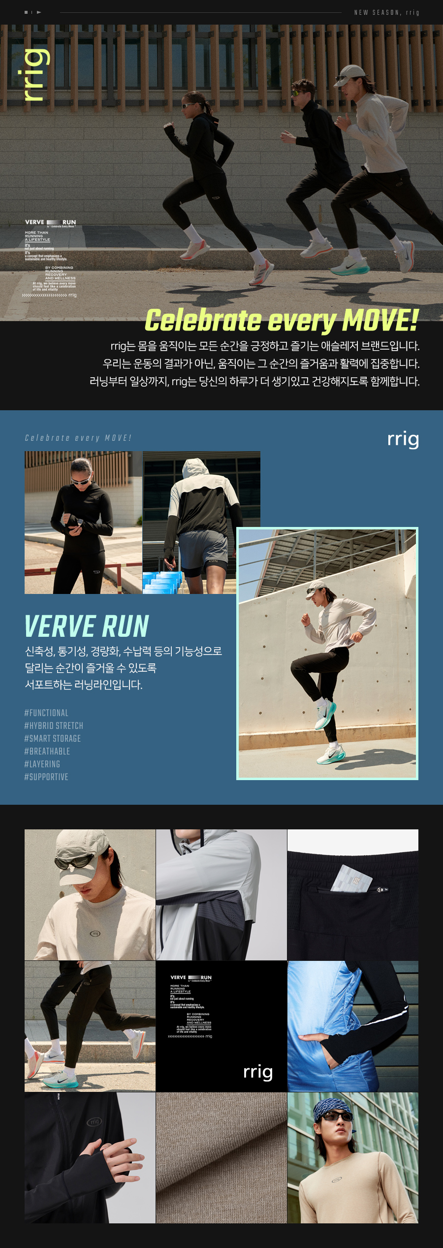 리그(RRIG)는 몸을 움직이는 모든 순간을 긍정하고 즐기는 애슬레저 브랜드입니다. 운동의 결과보다 움직이는 순간의 즐거움과 활력에 집중하며, 러닝부터 일상까지 생기 있고 건강한 하루를 함께합니다.
