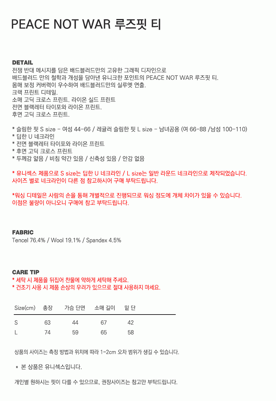 PEACE NOT WAR 루즈핏 티 - 더스티화이트