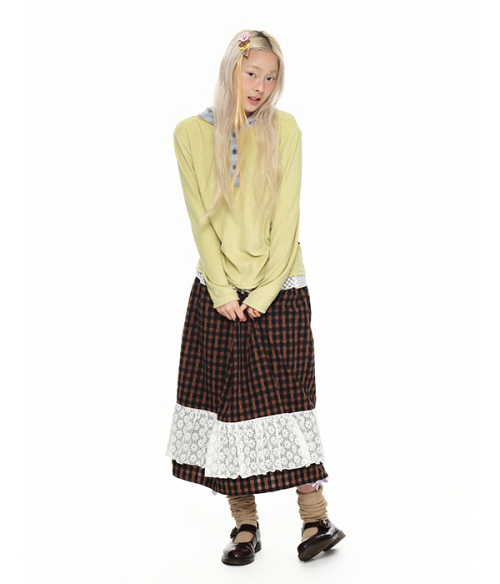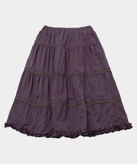체크 배색 프릴 포인트 볼륨 플레어 캉캉 미디 스커트 [퍼플]