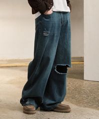 데미지 워시드 와이드 데님 팬츠 (BLUE)