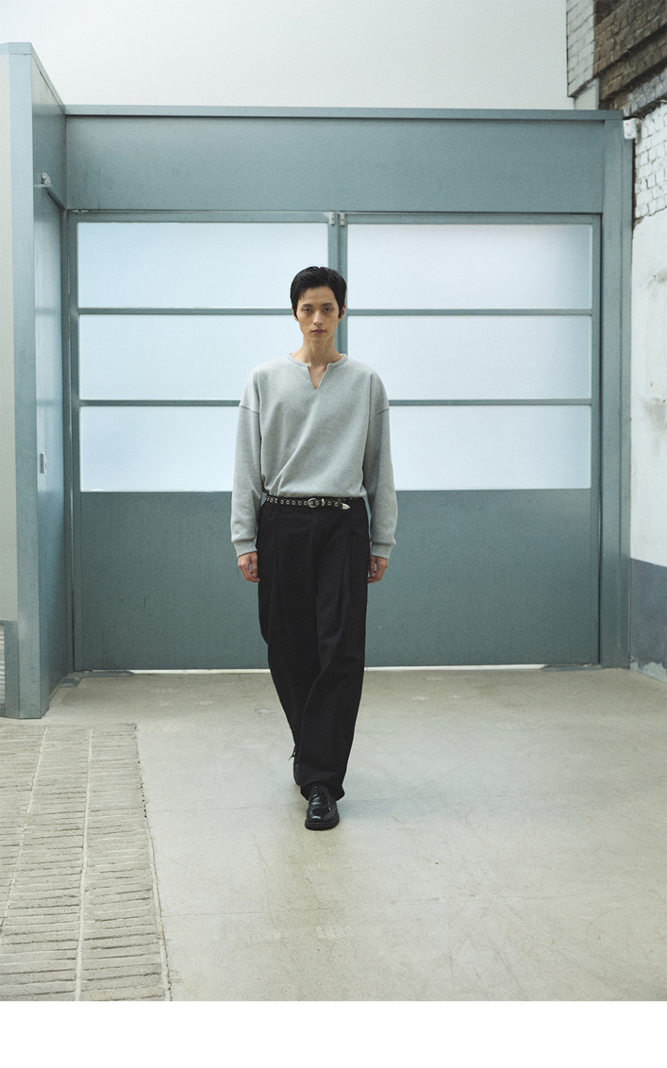 워시드 와플 니트 헨리 티 빈티지 블랙