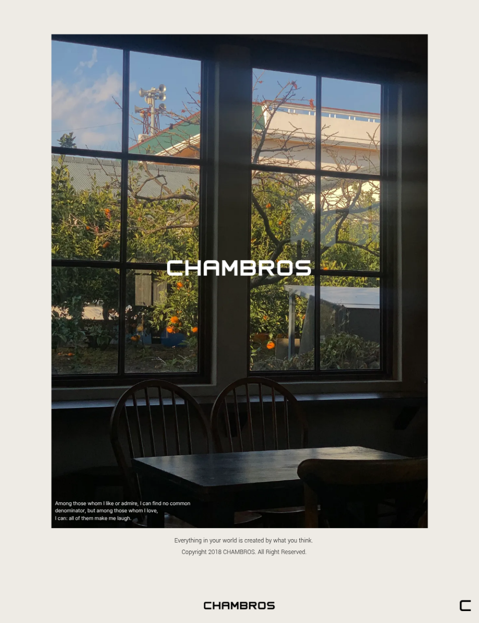 챔브로스(CHAMBROS)는 Chae Ambitious Brothers 약자의 합성어로 답답한 도시의 틀 속에서 벗어나 열정적인 생각과 감정을 갖고 챔브로스 만의 감성을 통해 각자의 자유와 개성을 표현할 수 있도록 고민하고 구현하는 스트릿 캐주얼 브랜드입니다.