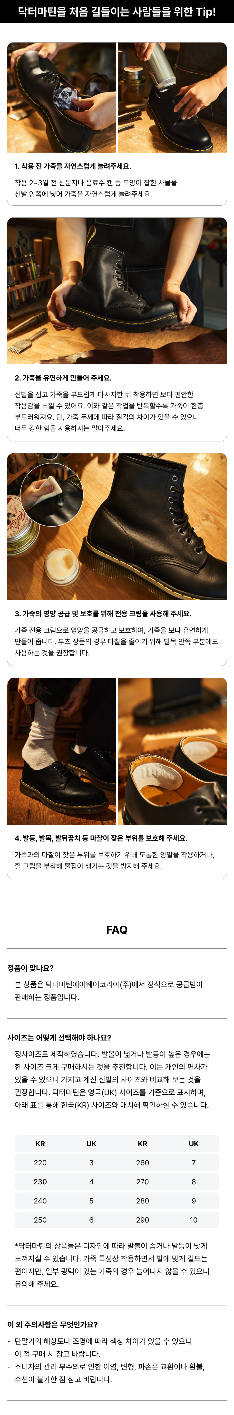 닥터마틴(DR.MARTENS)은 군인의 발을 편하게 만들기 위해 시작했지만 지금은 뮤지션, 패션피플, 모델 등의 사랑을 받는 상징적인 부츠 아이템으로 성장하며 한국뿐 아니라 전 세계에서 사랑을 받는 영국 브랜드로 자리매김을 했습니다. 편안한 착화감과 함께 다양한 스타일을 자랑하며, 신을 수록 자신의 개성과 스타일을 연출할 수 있게 돕는 독특한 매력도 함께 지니고 있습니다.
