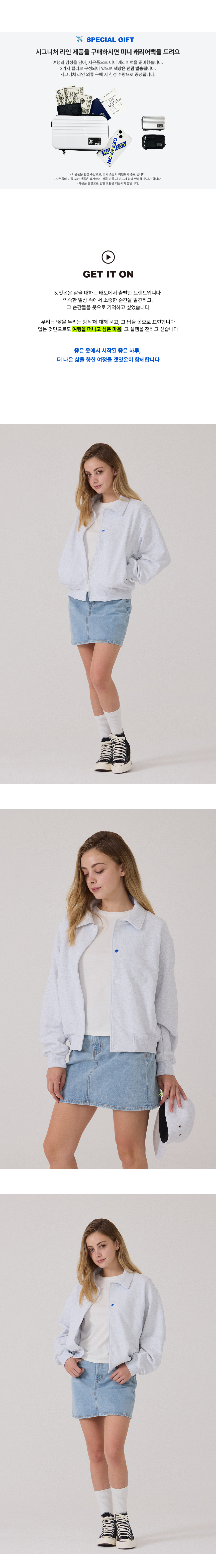 겟잇온(GET IT ON)은 '시작하다', '크게 즐기다', '최고다'라는 사전적 의미를 재해석해 'PLAY YOUR WAY!(지금 이 순간을 즐겨, 너만의 길을 가!)'라는 슬로건과 플레이 버튼을 브랜드 로고로 표현합니다. 나만의 활동(ON)과 쉼(OFF)을 통해 순수한 기쁨을 찾고 내면의 건강과 쉼 사이의 균형을 찾고자 합니다.