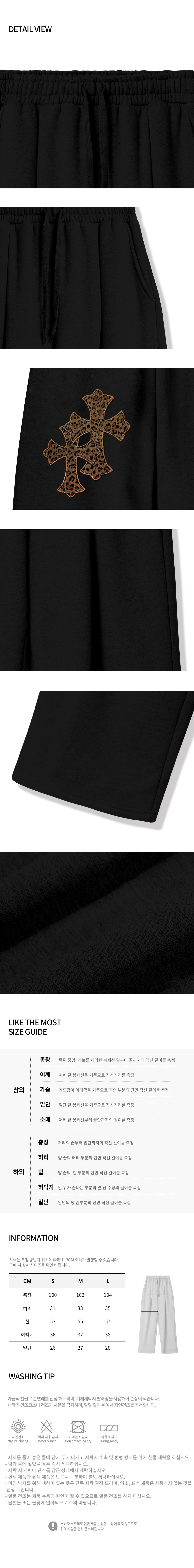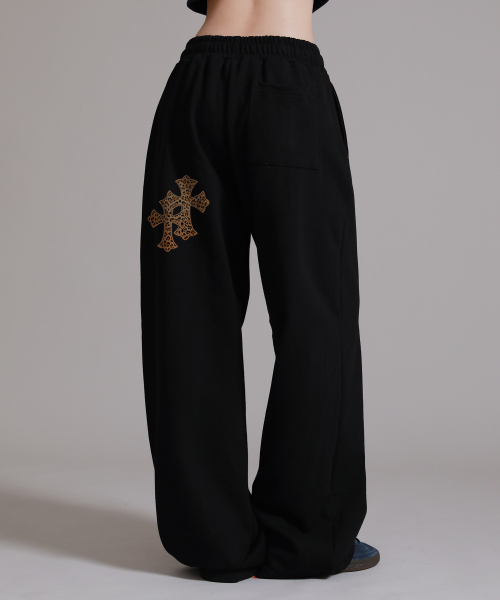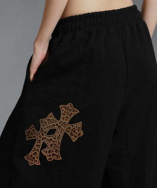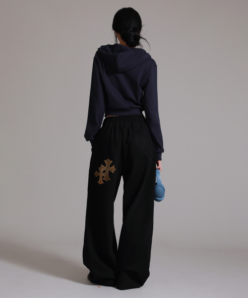 레오파드 트윈 크로스 아플리케 트레이닝 핀턱 와이드 팬츠_블랙
