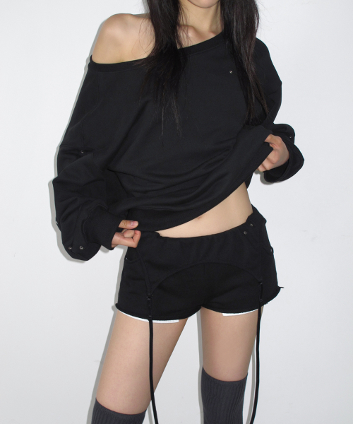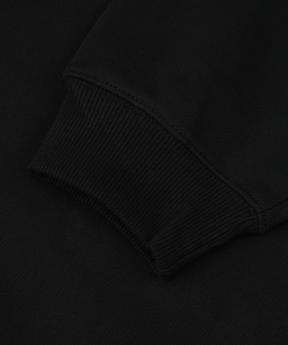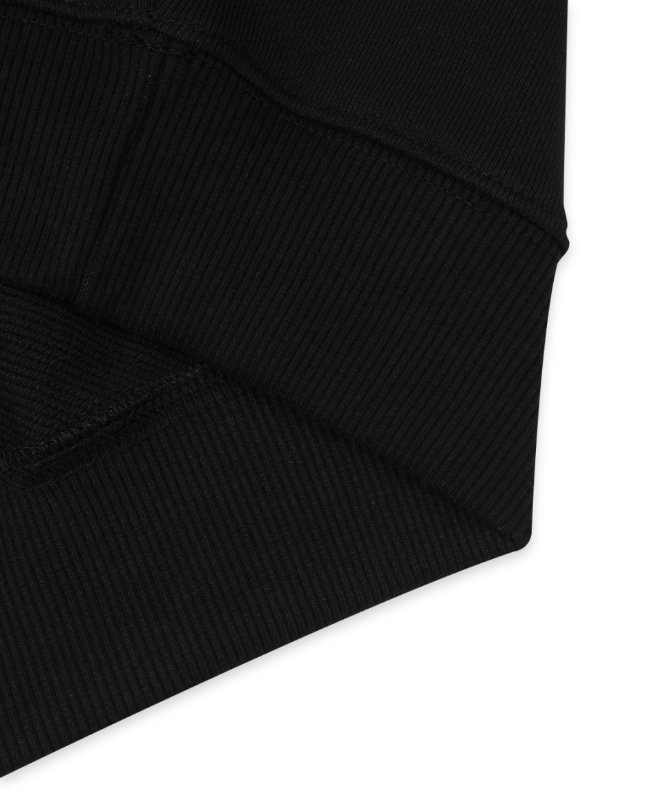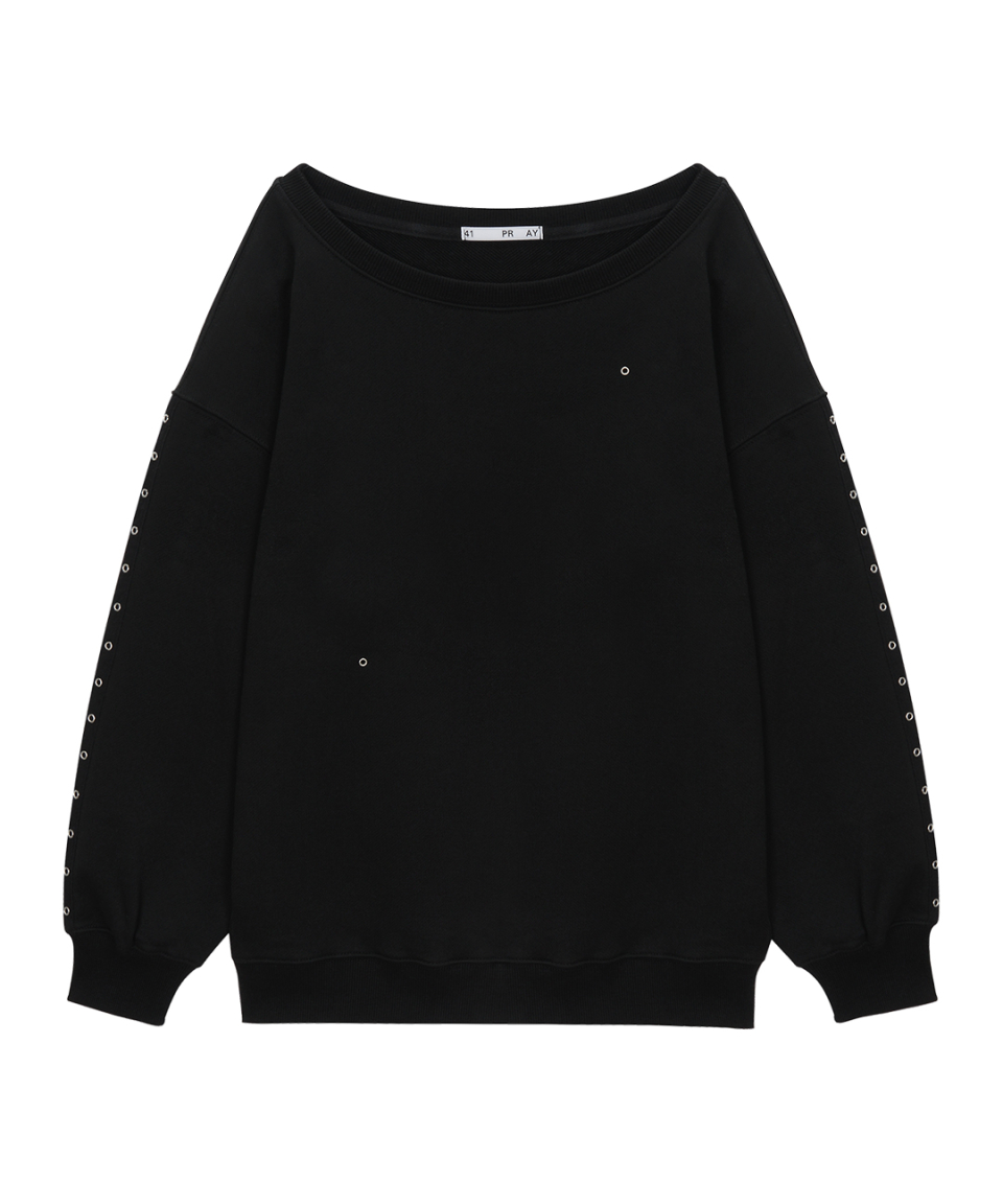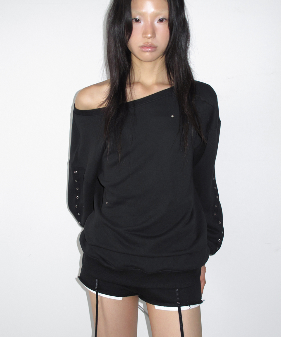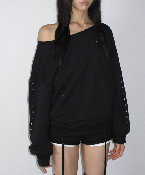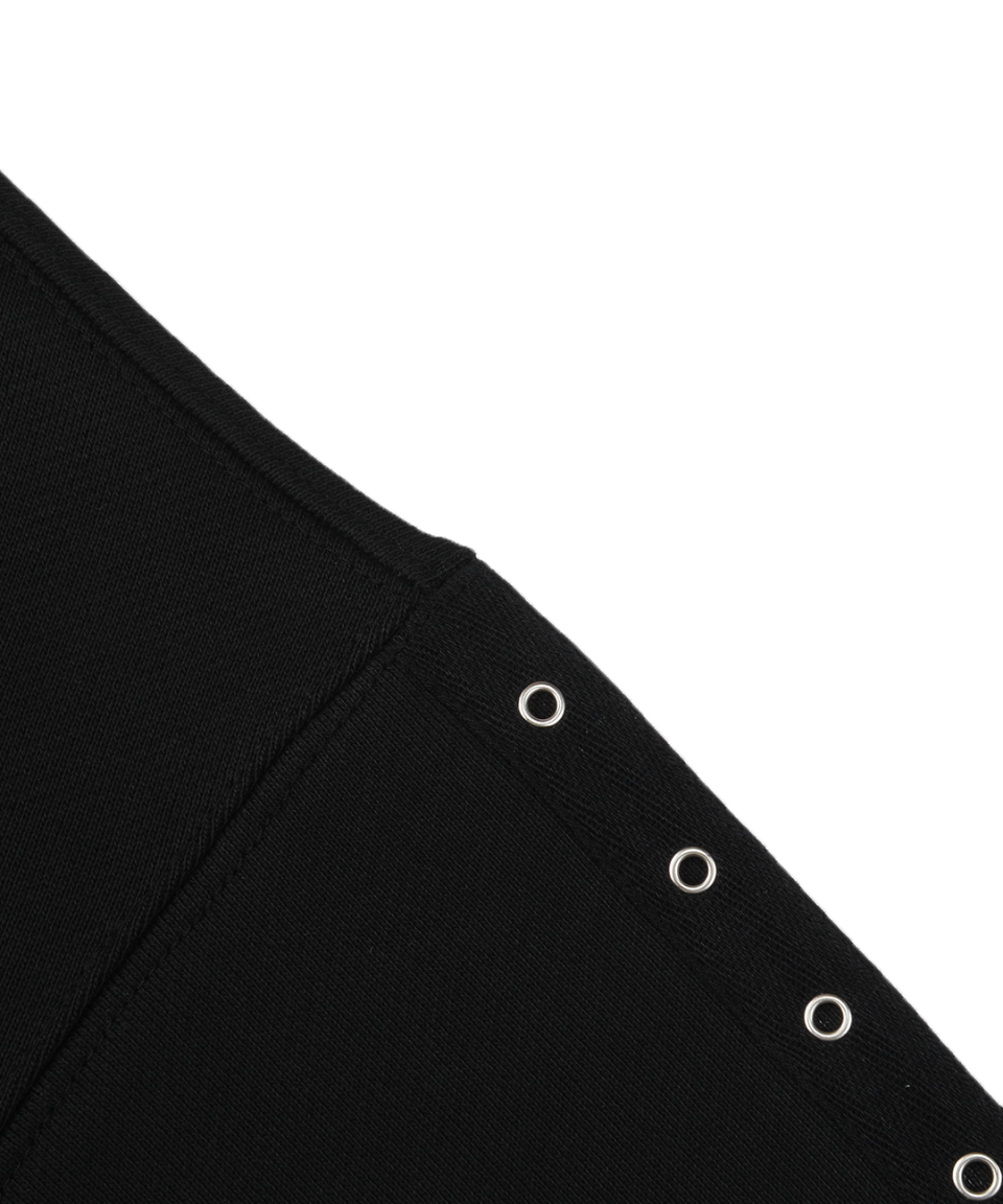Model Size Gonggong 170cm 44size OS착용 Product Information Color : Black Materials : Cotton 100 / Cotton95, Span5 (RIB) Size(cm) : 총장68 어깨63 가슴61.5 밑단41.5 소매기장50 Detail 오버 실루엣 소매 아일렛 테이프 몸판 아일렛 디테일