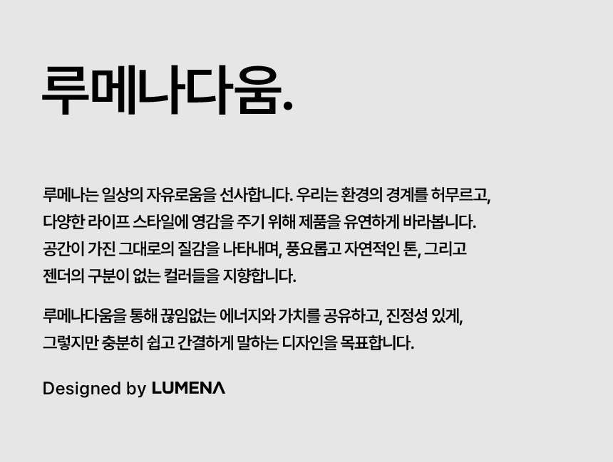 루메나(LUMENA)는 심플함과 정직함을 모토로 세심한 기술력과 디자인, 장인 정신을 담아 모두가 행복할 수 있도록 노력하는 브랜드입니다.