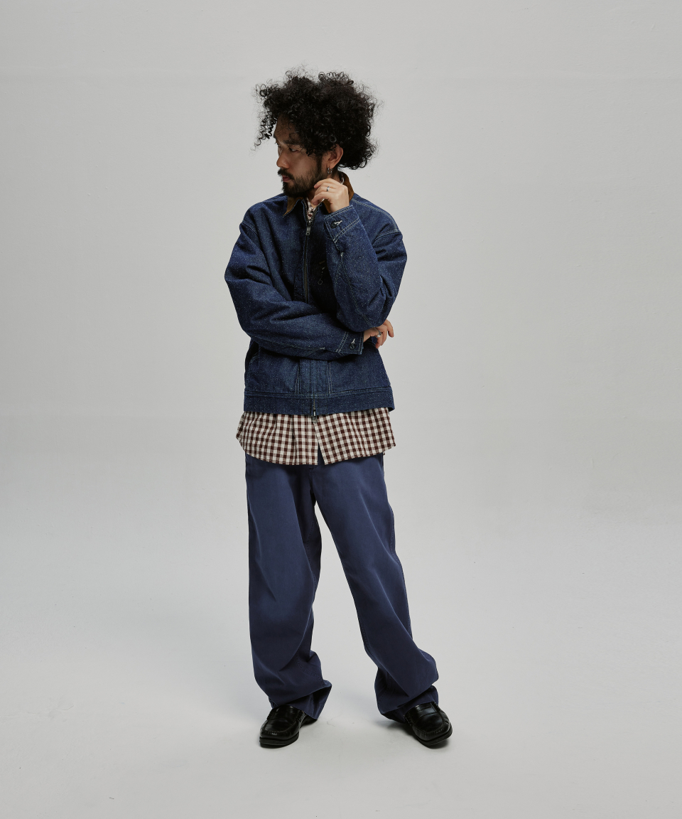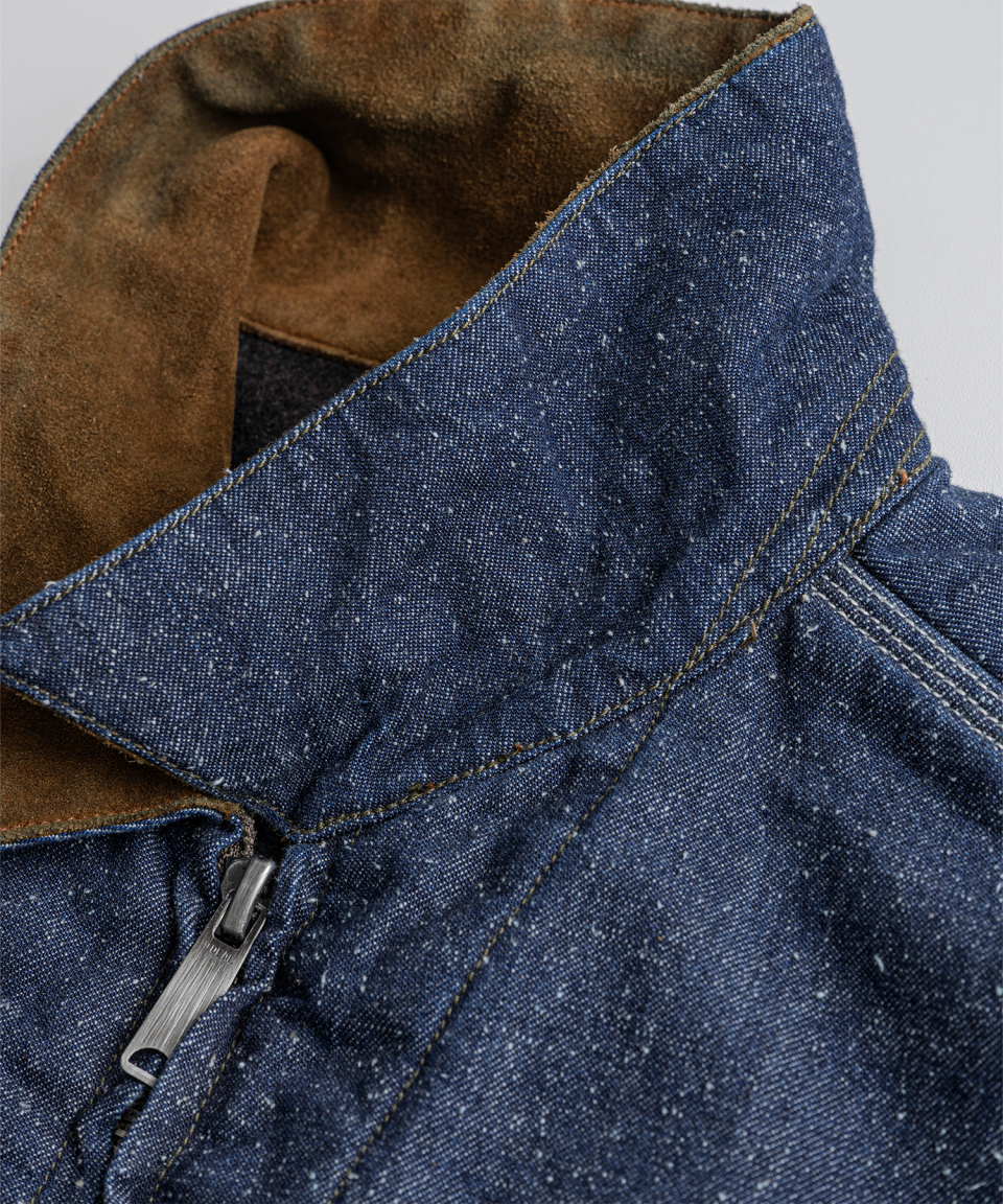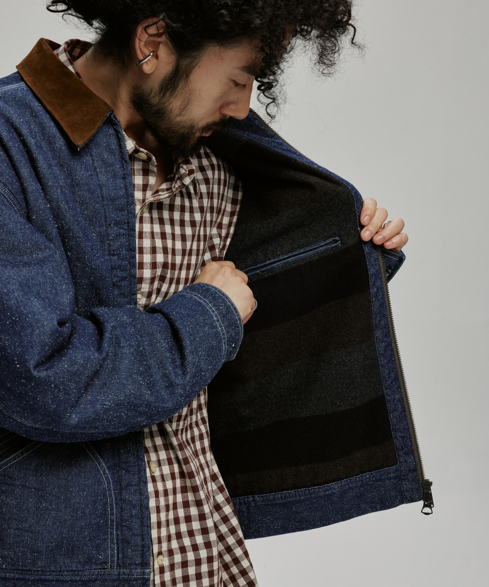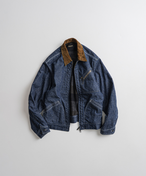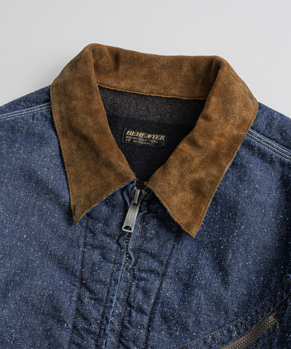 9.5oz 네프가 강하게 드러나는 데님 패브릭에 가벼운 워싱을 더해 자글거리는 표면감을 구현했으며, 오리지널의 코듀로이 카라는 스웨이드로 대체해 한층 포멀한 인상을 더했습니다.