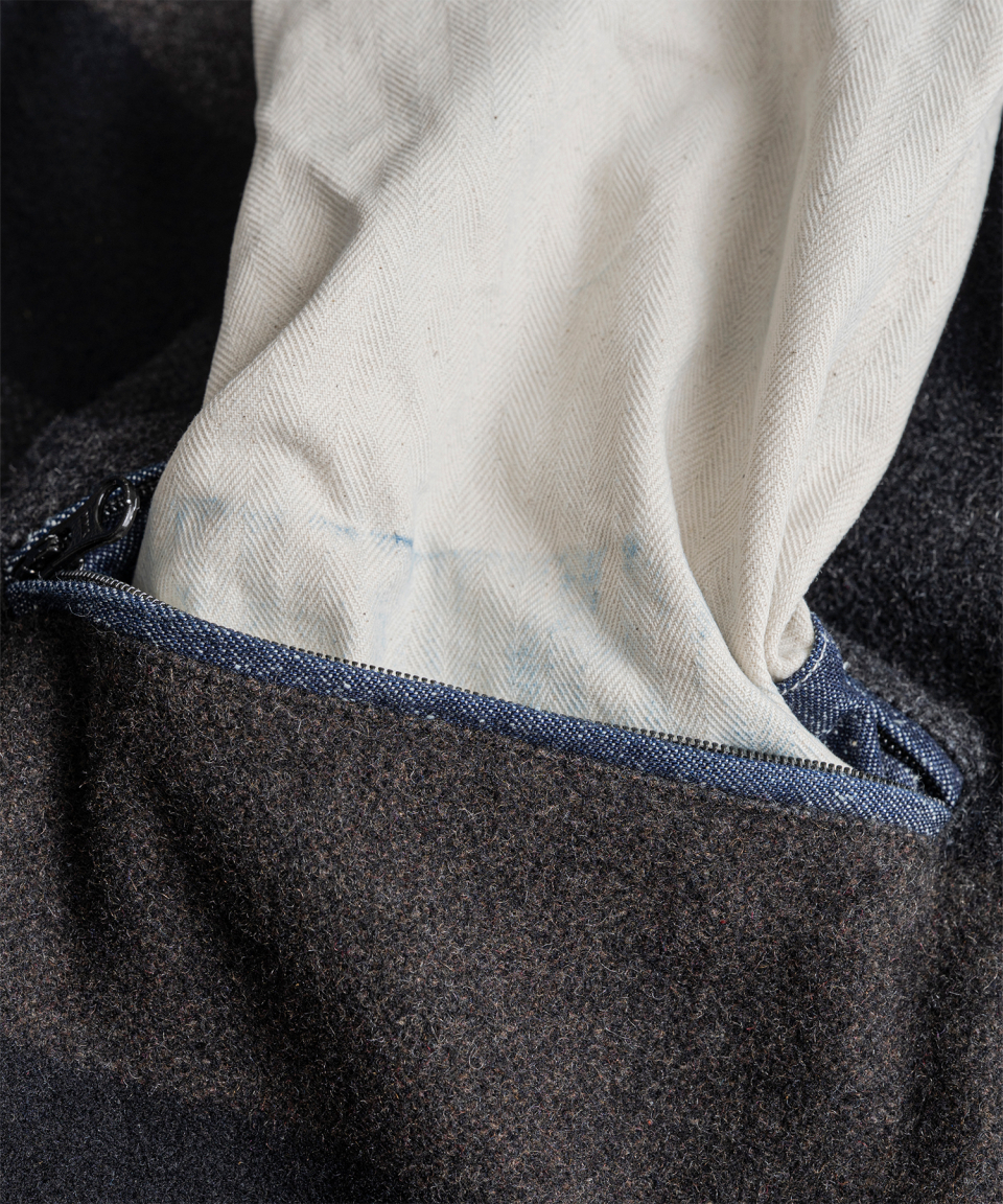 구간별로 다른 봉사 컬러, 트리플 스티치, 캣츠아이 버튼 등 당시의 고증 디테일을 충실히 구현했고, 몸판 안감에는 낮은 채도의 스트라이프 울 블랭킷을, 소매에는 퀼팅을 적용해 착용감을 보완했습니다.