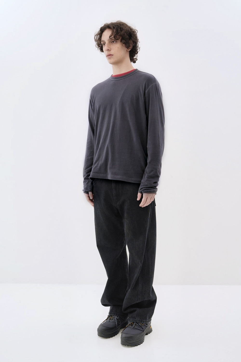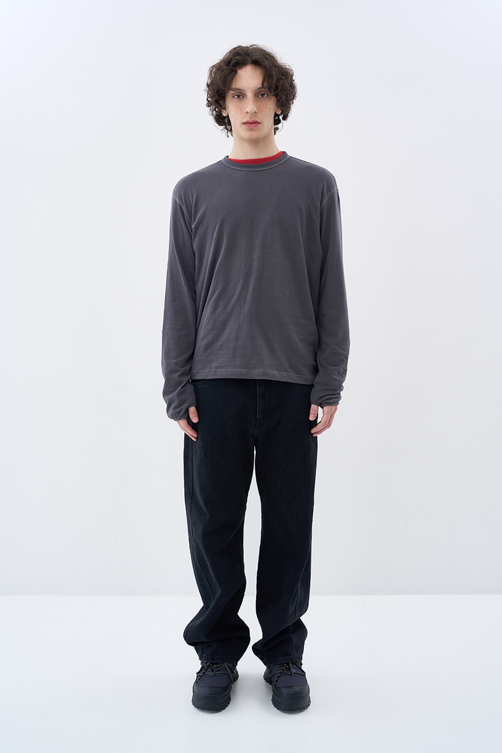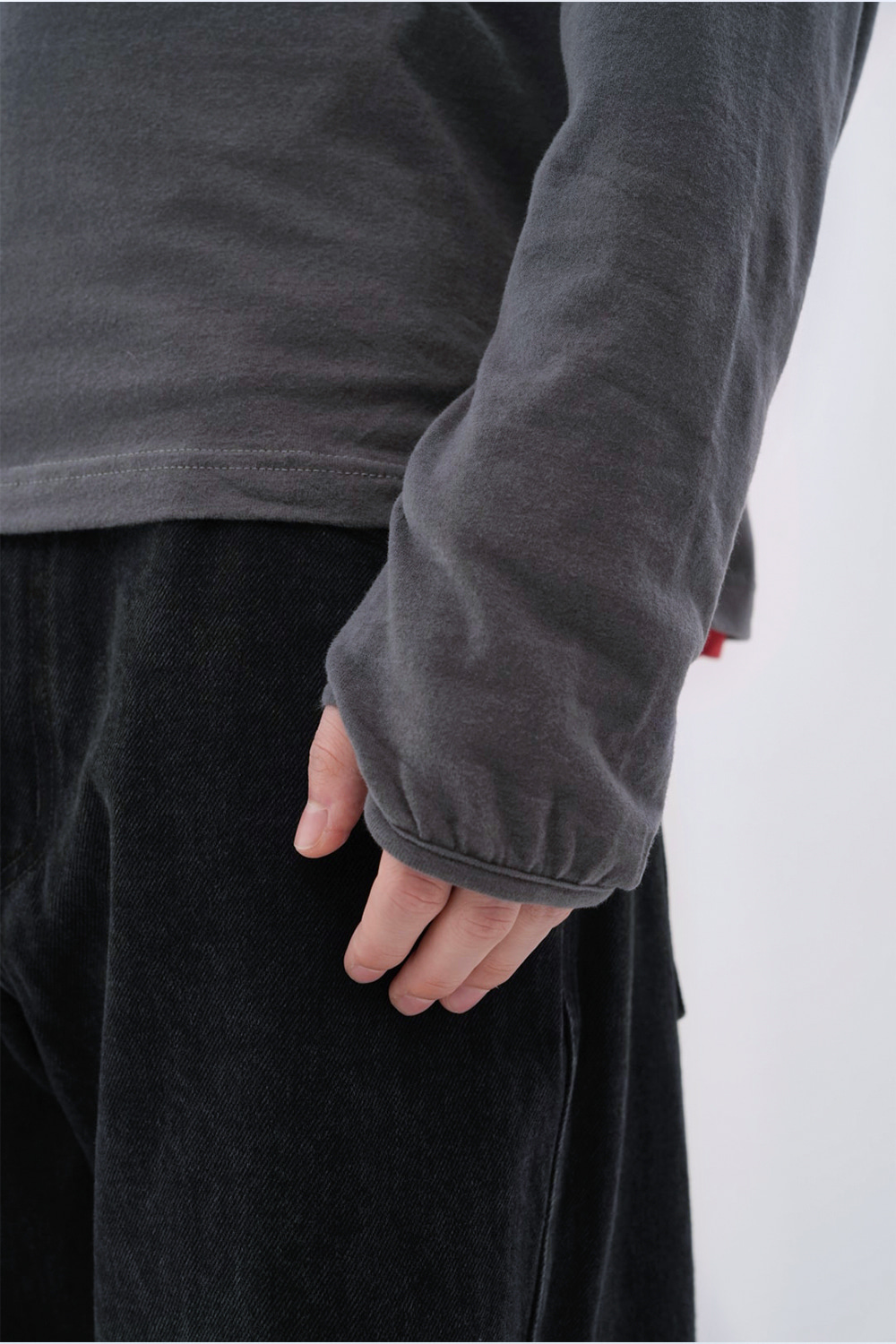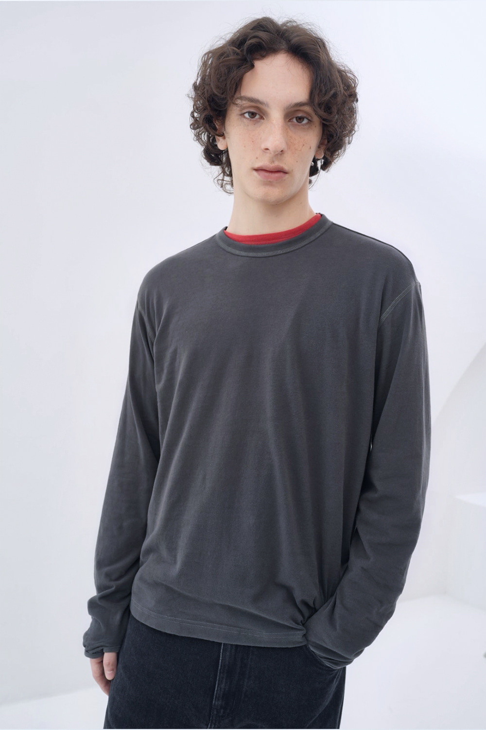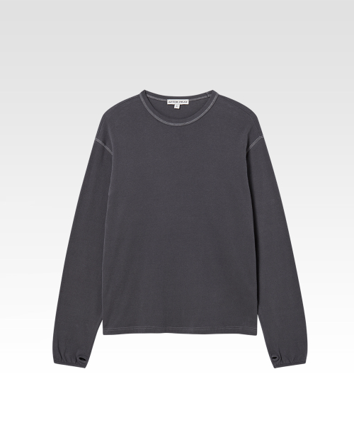 울 블렌디드 브러시드 코튼으로 완성한 롱 슬리브 티셔츠. 포근하고 부드러운 촉감이 몸을 타고 흐르는 오버사이즈드 핏. 콘트라스트 스티치와 핑거홀 파이핑으로 완성한 절제된 디테일. 편안한 착용감과 섬세한 마감이 공존하는 데일리 아이템.