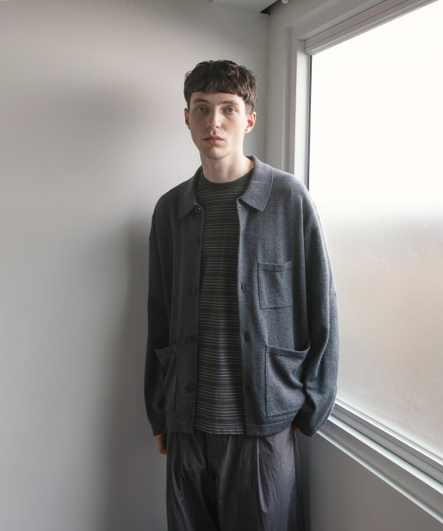 오랜 시간 착용한 듯한 커버올 자켓의 디자인과 색감을 살려 니트웨어로 표현한 Knitted Coverall Jacket 입니다