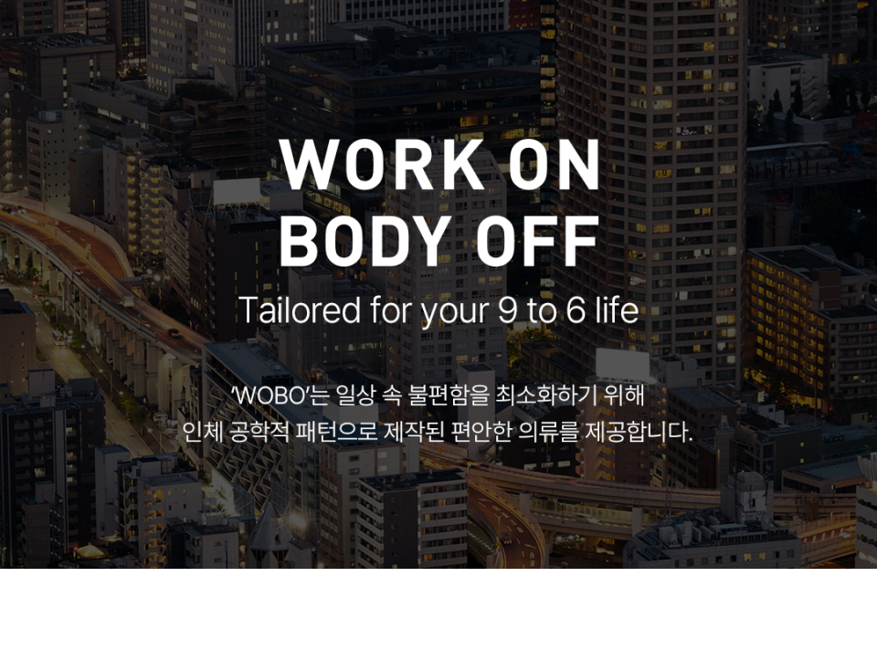 워크온바디오프(WORK ON BODY OFF)는 일상 속 불편함을 최소화 시키고자 탄생한 '오피스 워크 웨어' 브랜드입니다.