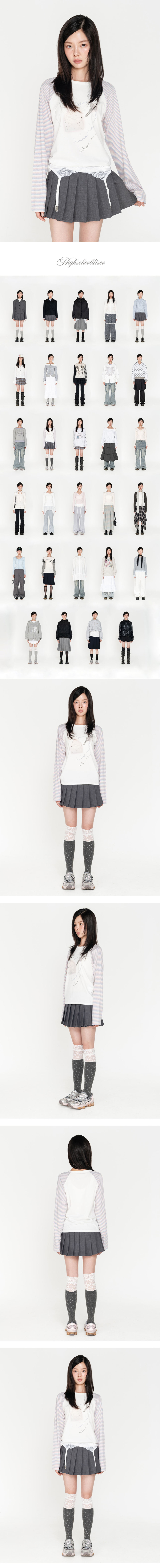 스트라이프 리본 퍼프소매 숏슬리브_메란지그레이