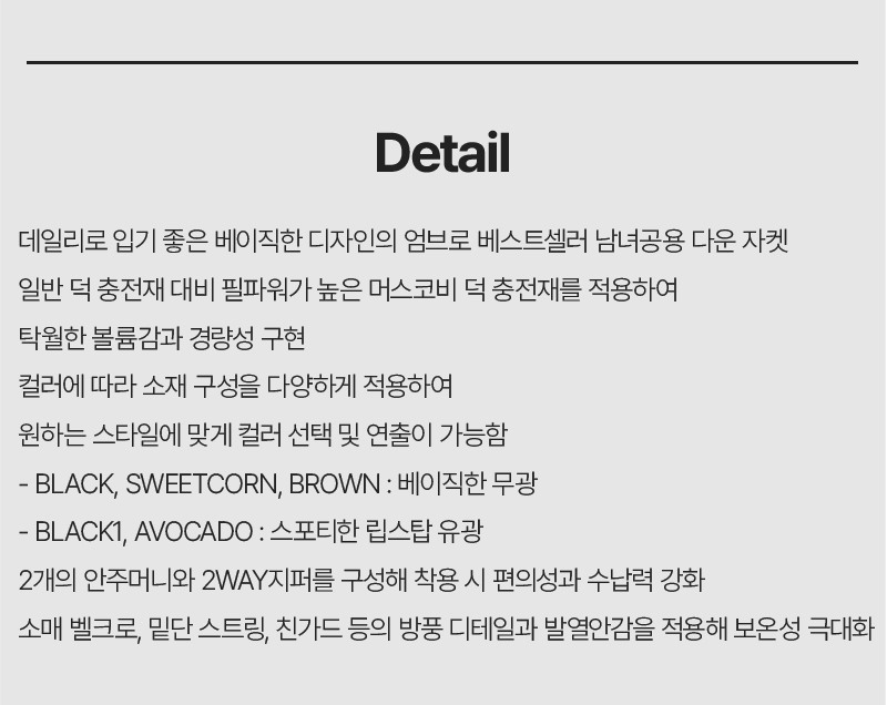 | 소재 | [AVO1]겉감:나일론(100),[AVO1]안감:나일론(100),[AVO1]충전재:오리솜털(80)오리깃털(20),[BLK0]겉감:폴리에스터(100),[BLK0]안감:나일론(100),[BLK0]충전재:오리솜털(80)오리깃털(20),[BLK1]겉감:나일론(100),[BLK1]안감:나일론(100),[BLK1]충전재:오리솜털(80)오리깃털(20),[BRW0]겉감:폴리에스터(100),[BRW0]안감:나일론(100),[BRW0]충전재:오리솜털(80)오리깃털(20),[SCW0]겉감:폴리에스터(100),[SCW0]안감:나일론(100),[SCW0]충전재:오리솜털(80)오리깃털(20) (입고 시기에 따라 정보가 상이할 수 있어, 수령하신 상품의 라벨을 참고하시기 바랍니다.) |