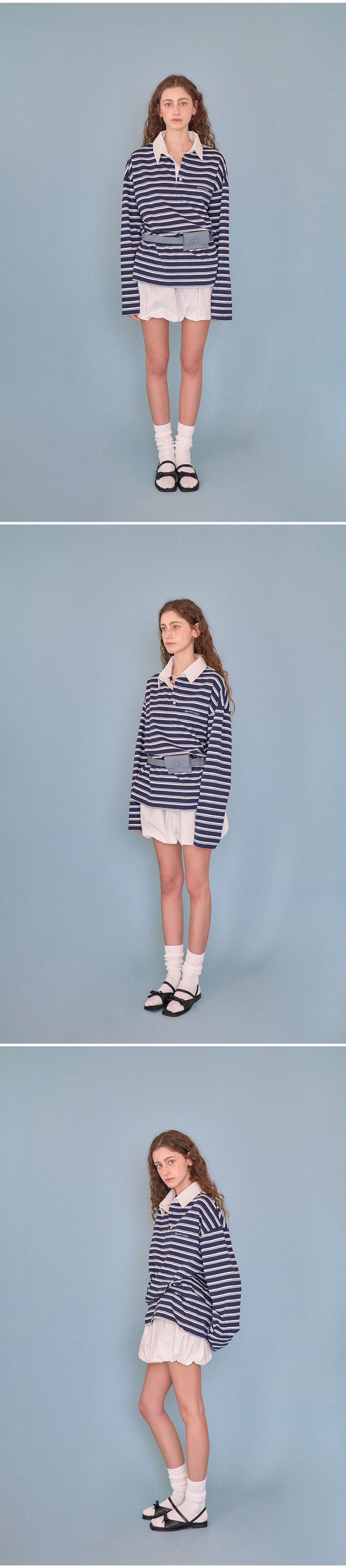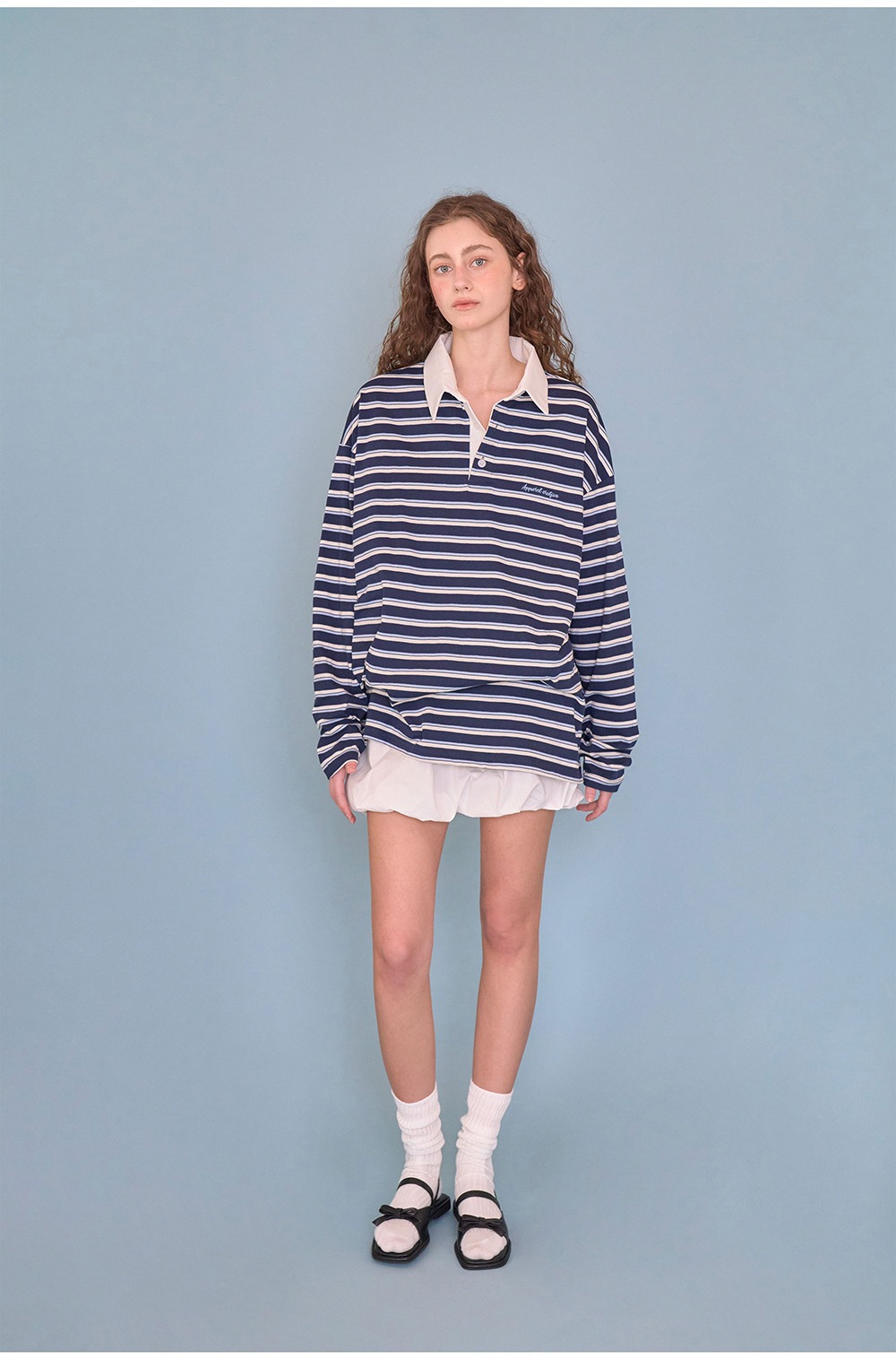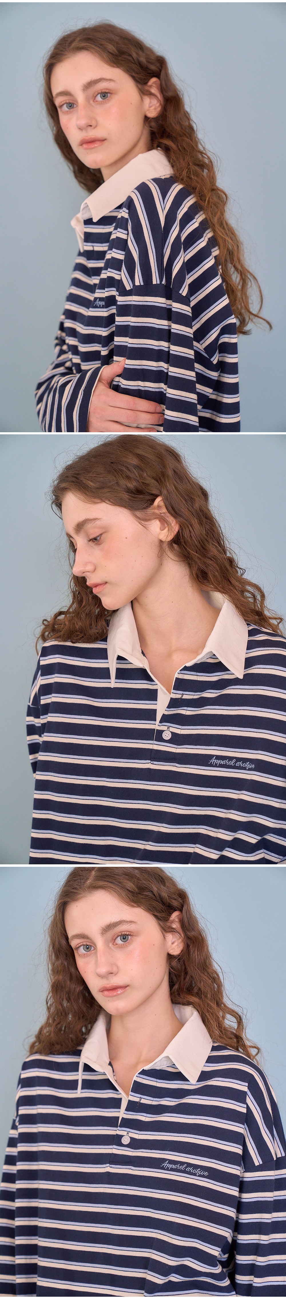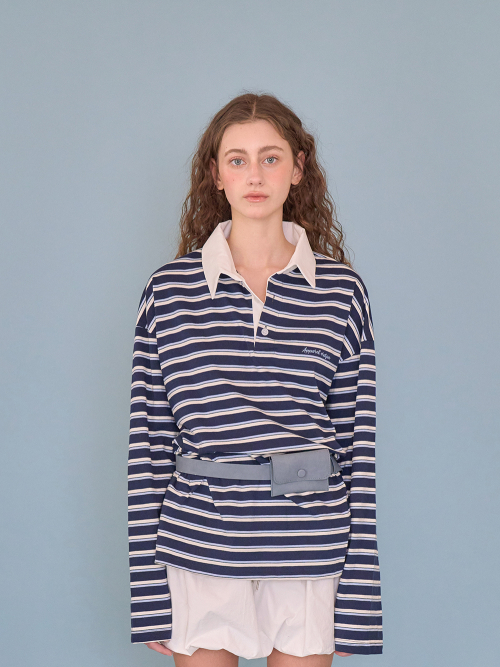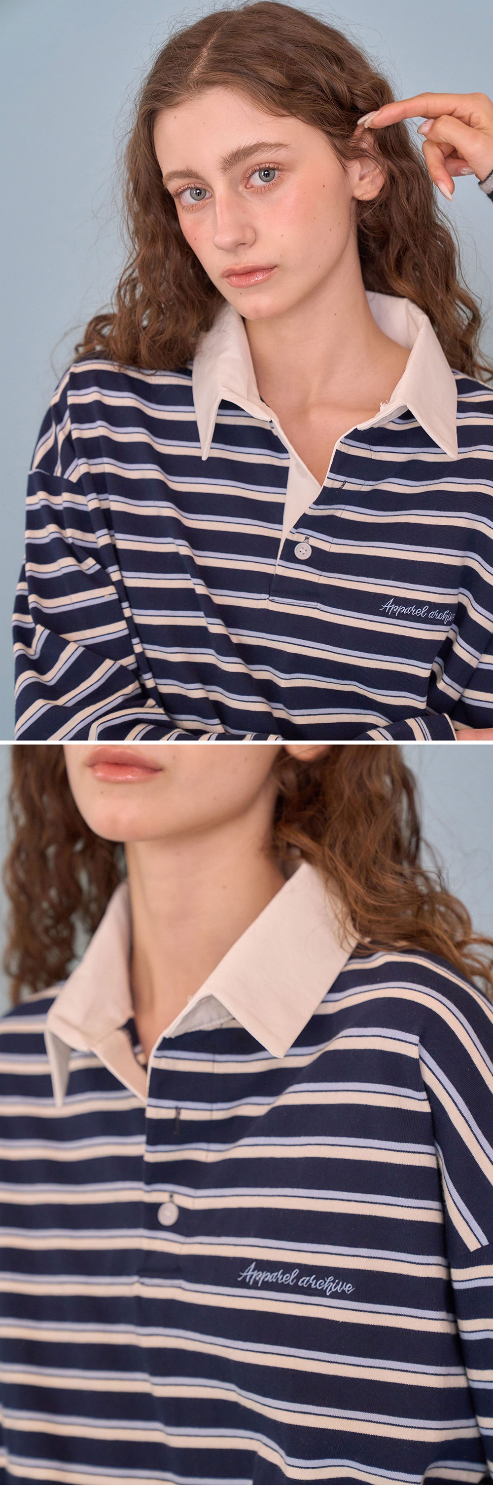 COMMENT - 네이비 컬러의 단정한 분위기의 코튼 패브릭 세 컬러의 조화가 돋보이는 스트라이프 패턴의 오버핏 실루엣 왼쪽 상단의 로고 자수 디테일 FABRIC - Cotton 100% SIZE - Free 총장 70 어깨 58 가슴 60 밑단 60.5 암홀 27 소매길이 61 소매단면 14 MODEL SIZE - Model 168cm