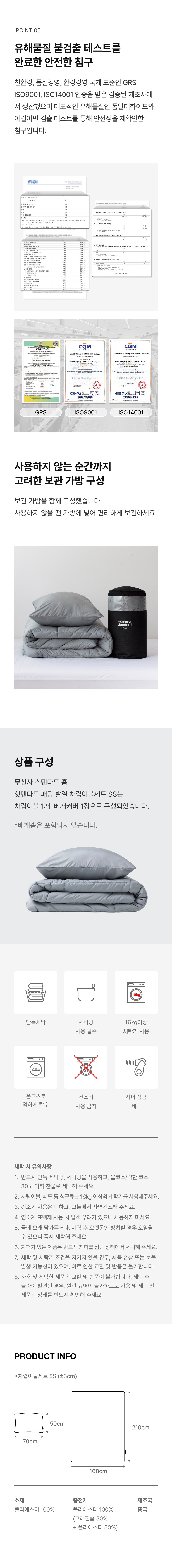 힛탠다드 패딩 발열 차렵이불세트 SS [그레이]