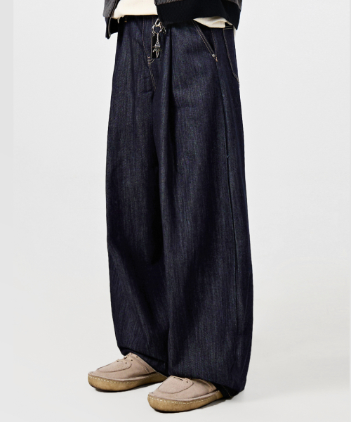 원턱 커브드 크리즈 워싱 와이드 데님 팬츠_슬럽 딥 인디고