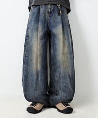 원턱 커브드 크리즈 워싱 와이드 데님 팬츠_더스트 인디고