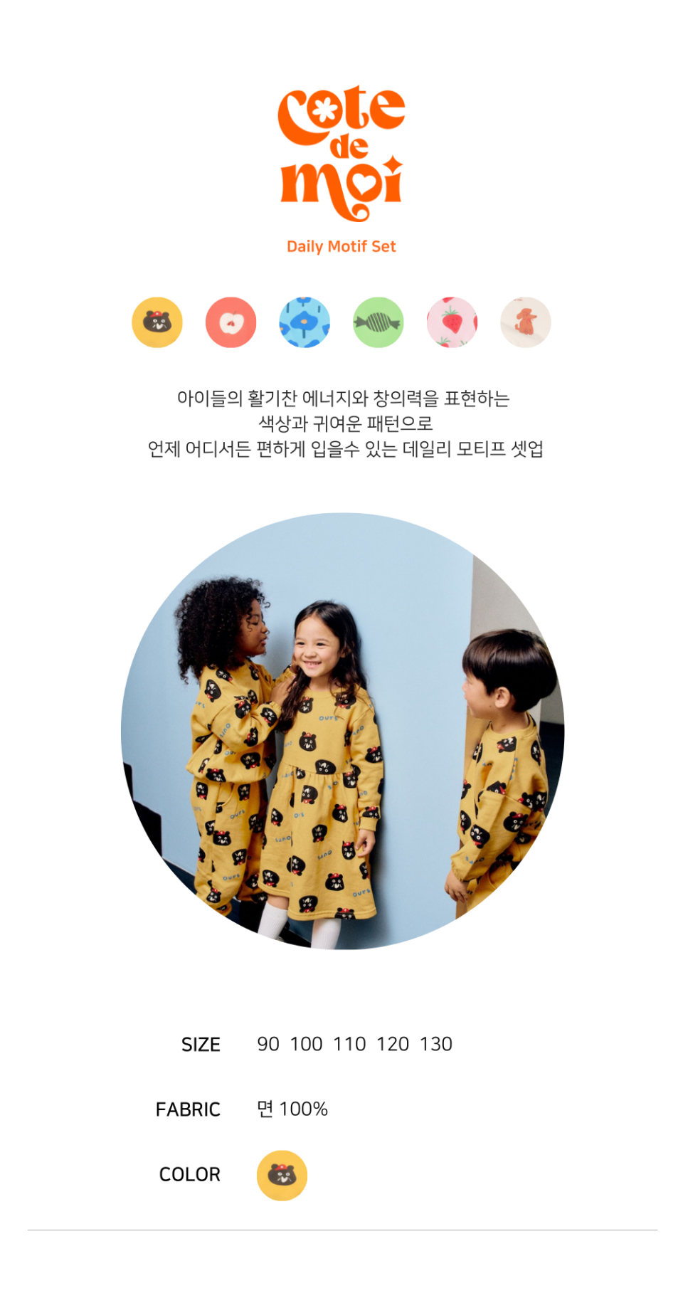 꼬떼드무어(COTE DE MOI)는 '내 옆에'라는 뜻을 담고 있습니다. 아이들과의 모든 순간을 함께하고자 하는 마음을 담아 디자인한 브랜드입니다.