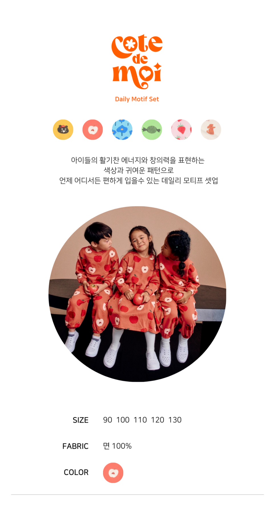 꼬떼드무어(COTE DE MOI)는 '내 옆에'라는 뜻을 담고 있습니다. 아이들과의 모든 순간을 함께하고자 하는 마음을 담아 디자인한 브랜드입니다.