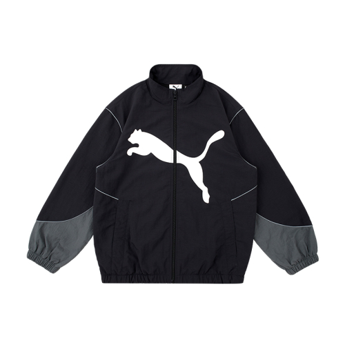 푸마의 아이코닉한 트랙 컬러 블록 컷라인과 빅 캣 나염이 돋보이는 바람막이 입니다.