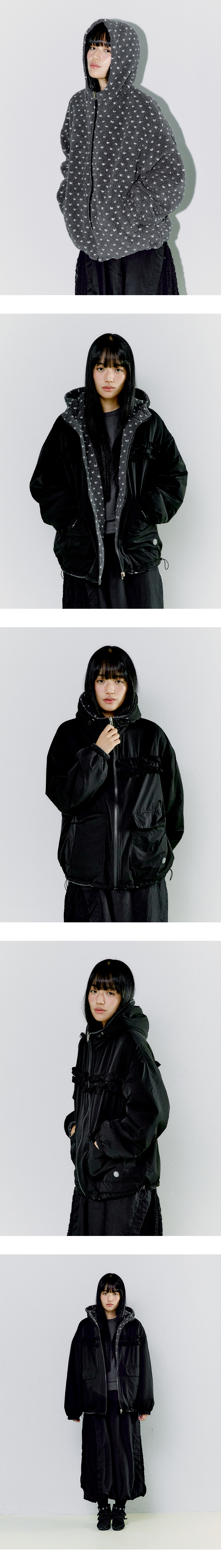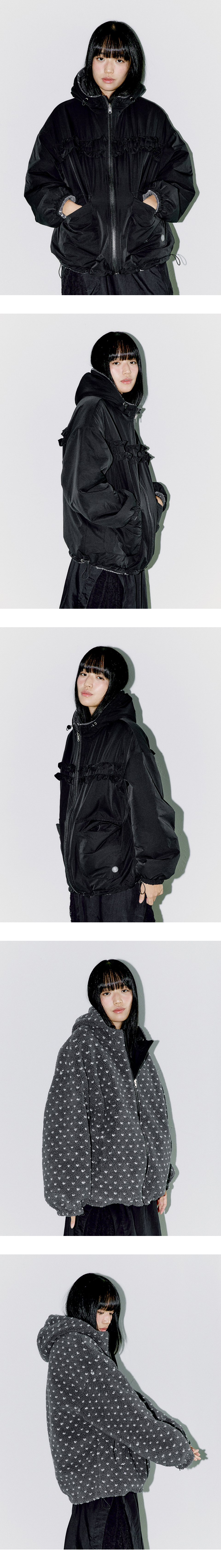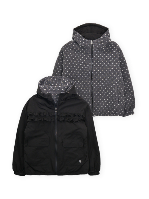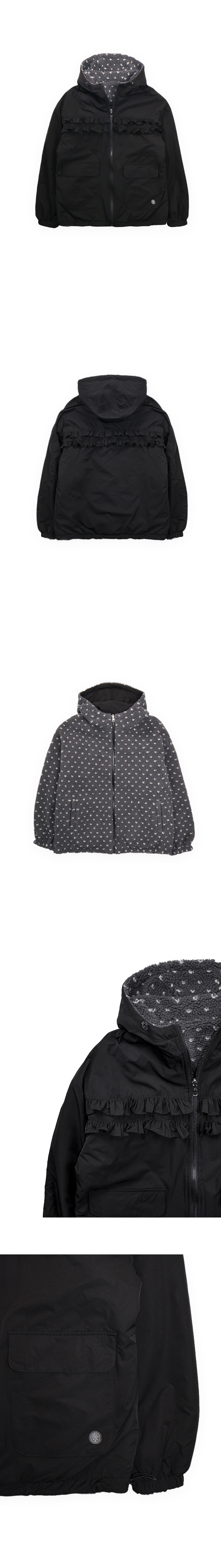 REVERSIBLE FRILL HOODED JACKET, BLACK/DOT