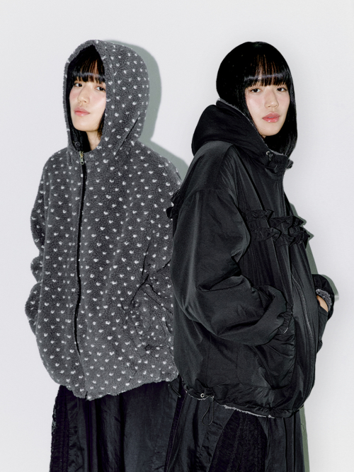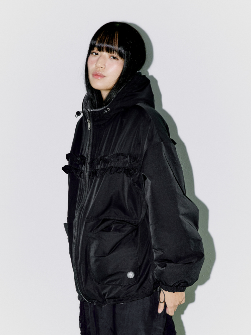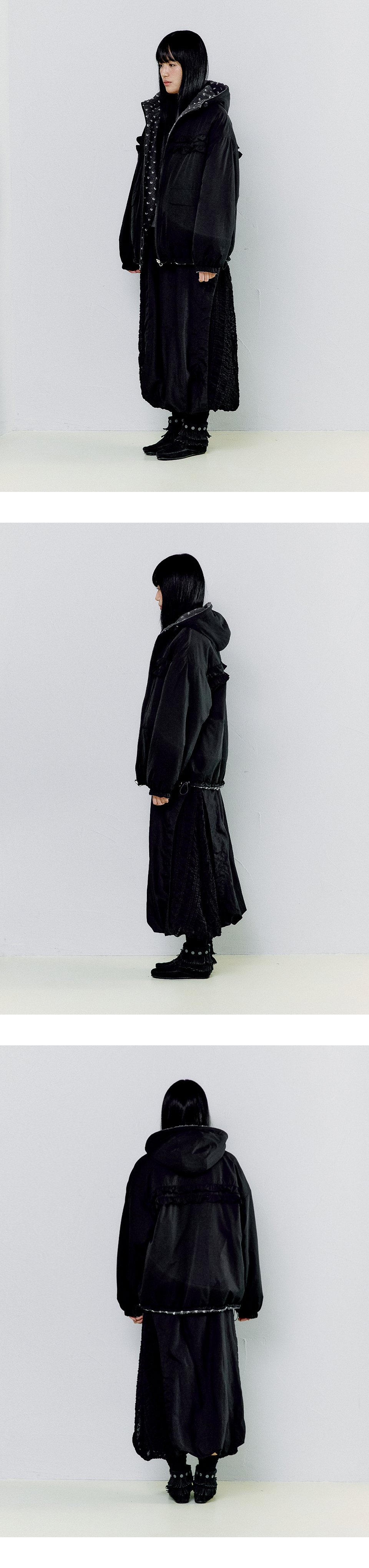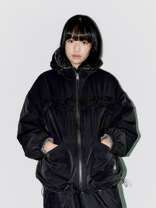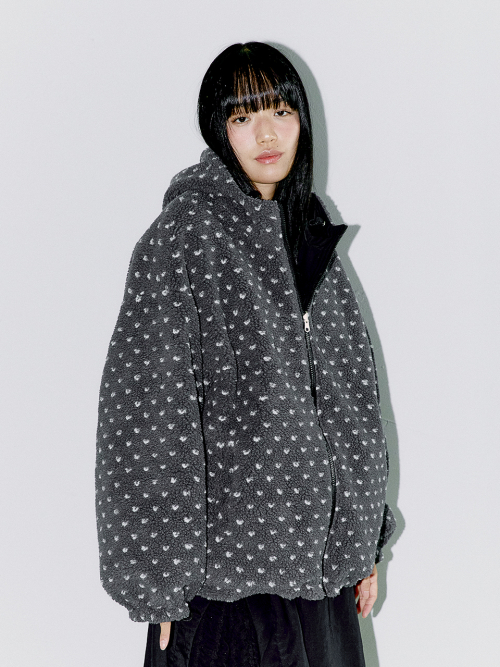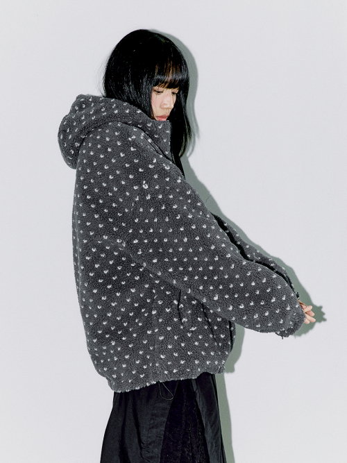 REVERSIBLE FRILL HOODED JACKET, BLACK/DOT