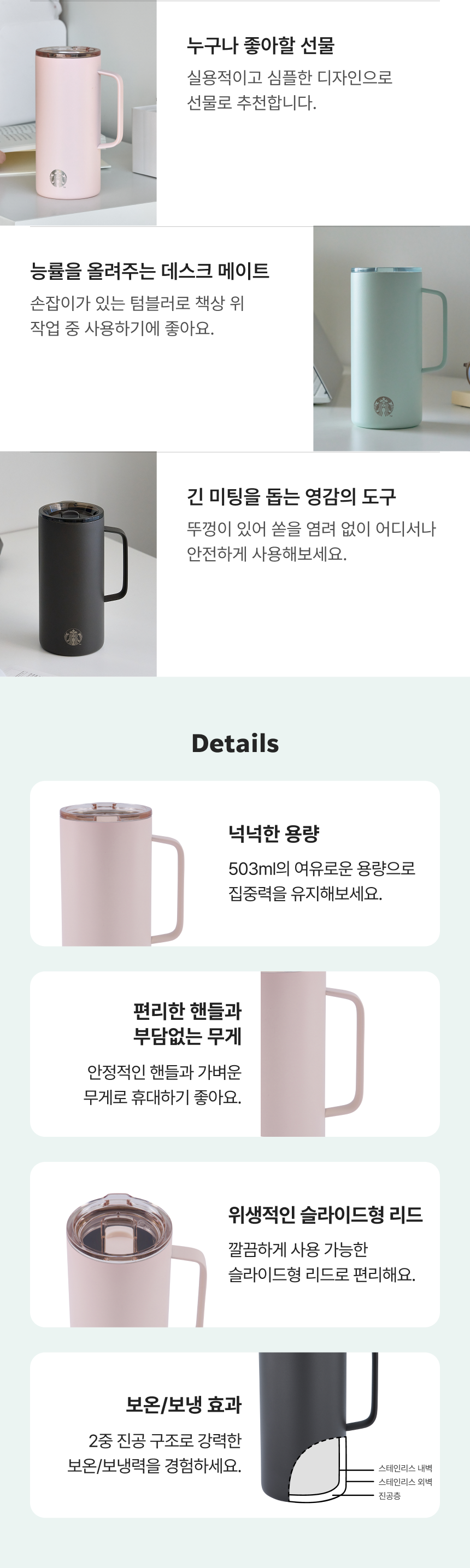 스타벅스(STARBUCKS)는 “커피 이상의 특별한 경험”을 전하며, 전 세계인의 생활 속에 스며든 글로벌 커피 브랜드입니다. 일상을 풍요롭게 하는 다양한 라이프스타일 제품을 선보입니다.