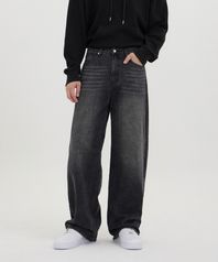 입체 곡선 백플랩 포켓 벌룬핏 와이드 데님 팬츠 유니섹스 (블랙)
