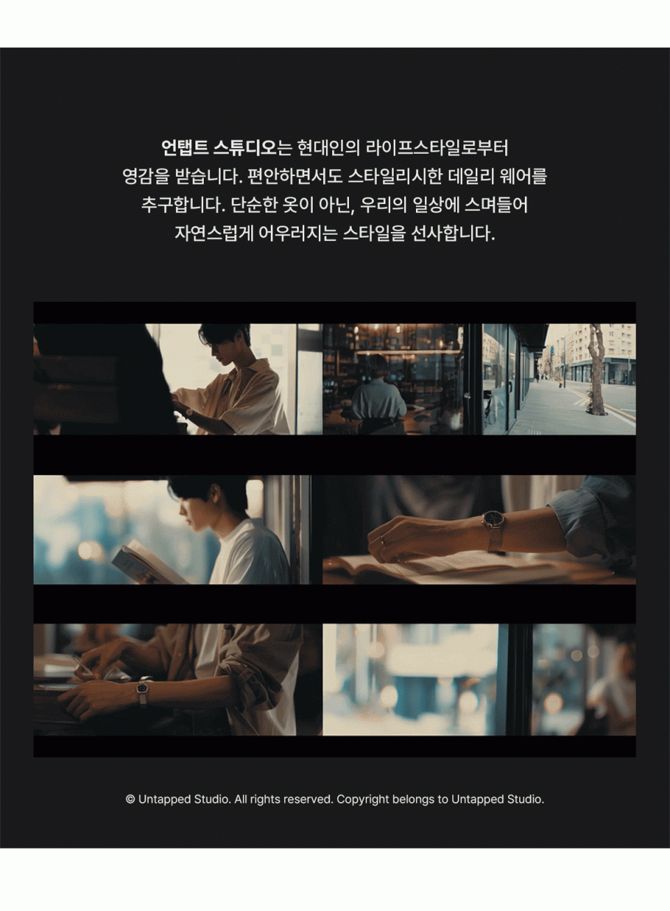 언탭트 스튜디오(UNTAPPED STUDIO)는 모던 베이식 캐주얼 웨어를 지향합니다. 누구나 쉽게 도전할 수 있는 디테일을 다양한 컬러로 표현하며 합리적인 가격으로 선보이는 브랜드입니다.