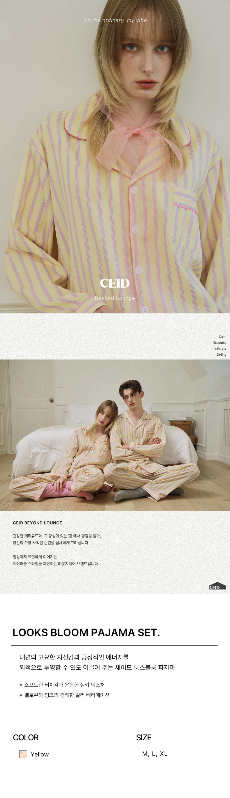 세이드(CEID)는 건강한 에티튜드와 그 중심에 있는 'HOME'에서 영감을 받아, 당신의 가장 사적인 순간을 섬세하게 그려내며, 일상까지 유연하게 이어지는 웨어러블 스타일을 제안하는 라운지웨어 브랜드입니다.