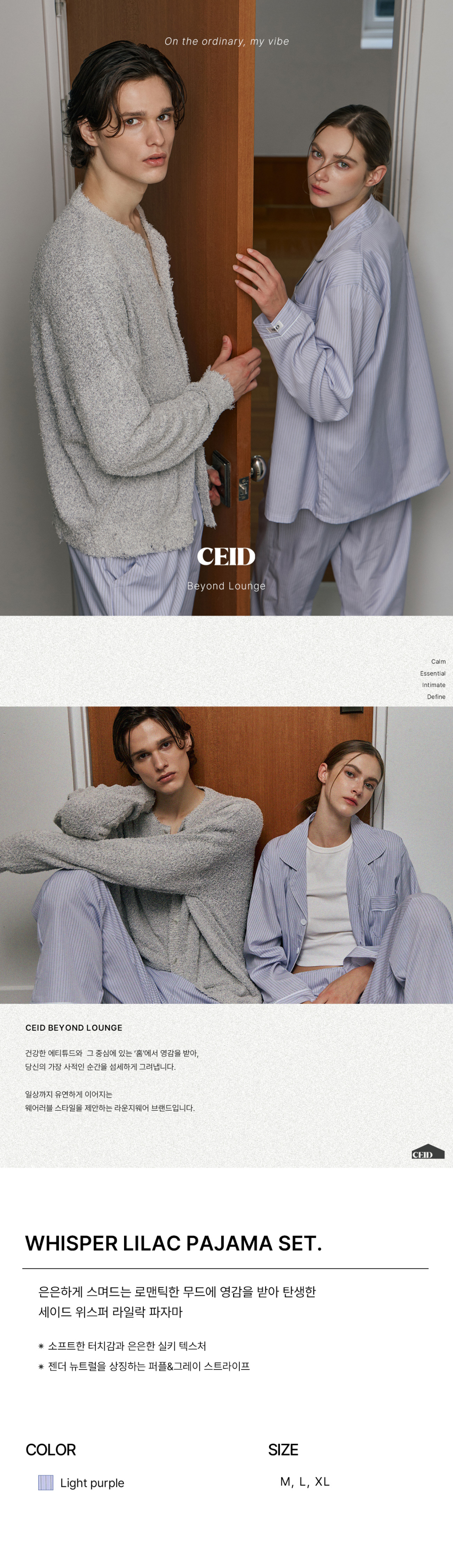 세이드(CEID)는 건강한 에티튜드와 그 중심에 있는 'HOME'에서 영감을 받아, 당신의 가장 사적인 순간을 섬세하게 그려내며, 일상까지 유연하게 이어지는 웨어러블 스타일을 제안하는 라운지웨어 브랜드입니다.