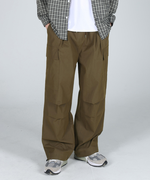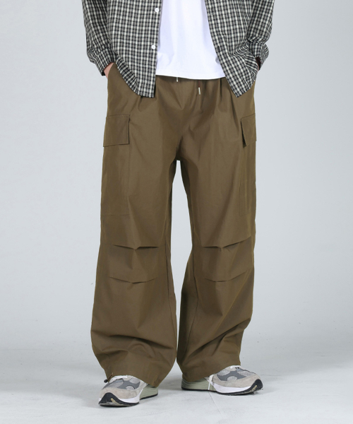 코튼 나일론 카고 벌룬 투턱 스트링 팬츠_카키브라운