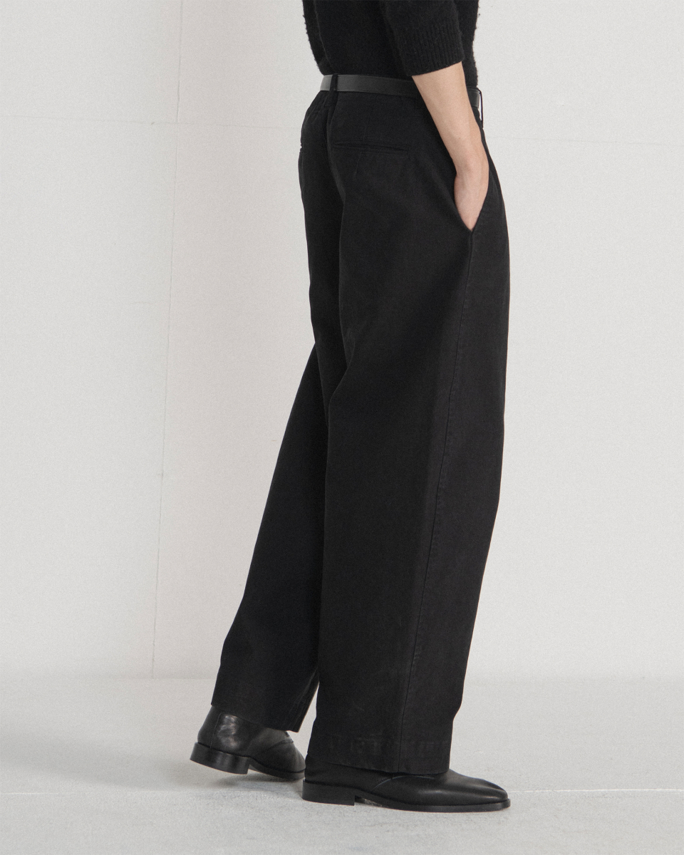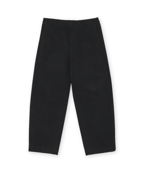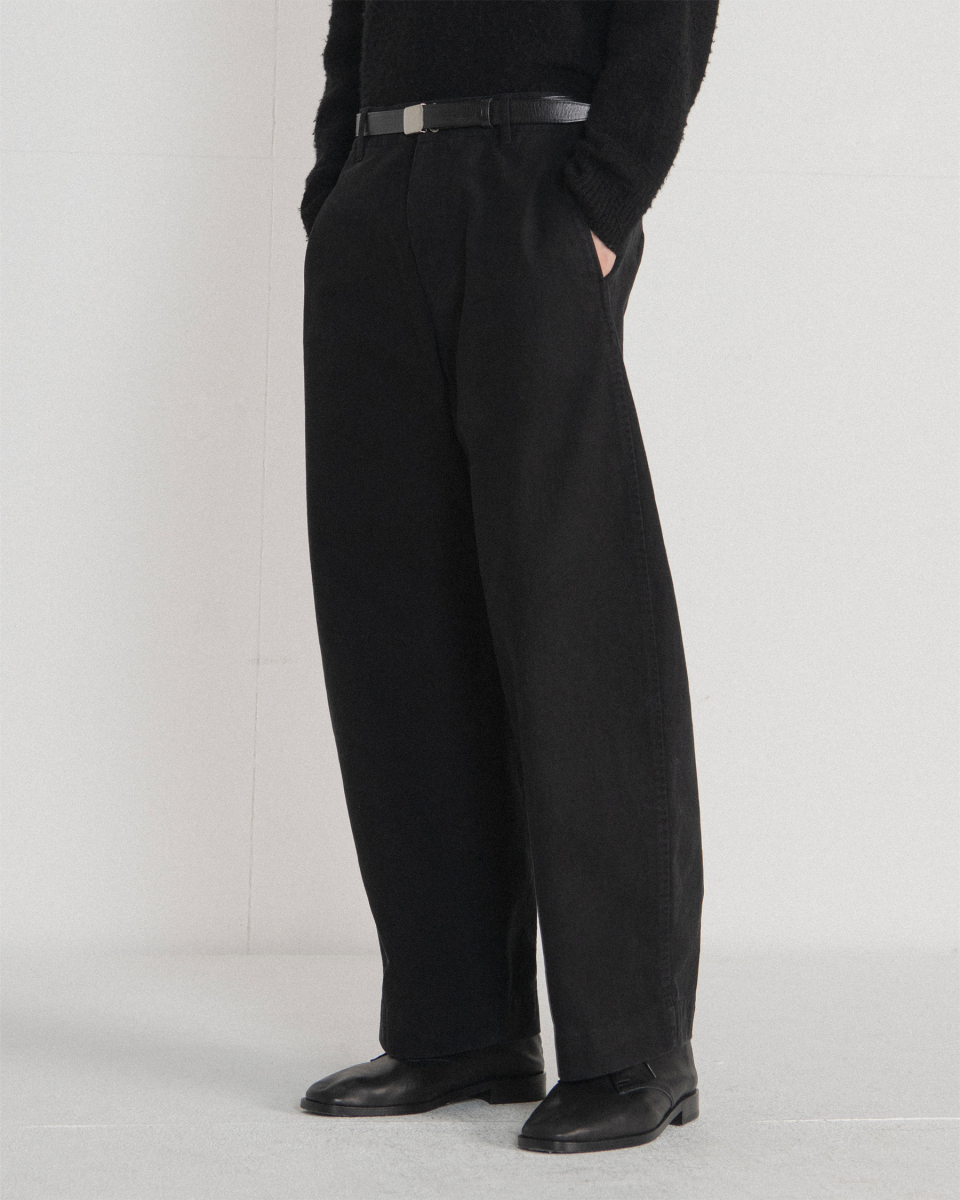 허벅지 라인에서 밑단까지 자연스럽게 이어지는 곡선 실루엣이 특징인 워시드 필드 팬츠입니다.