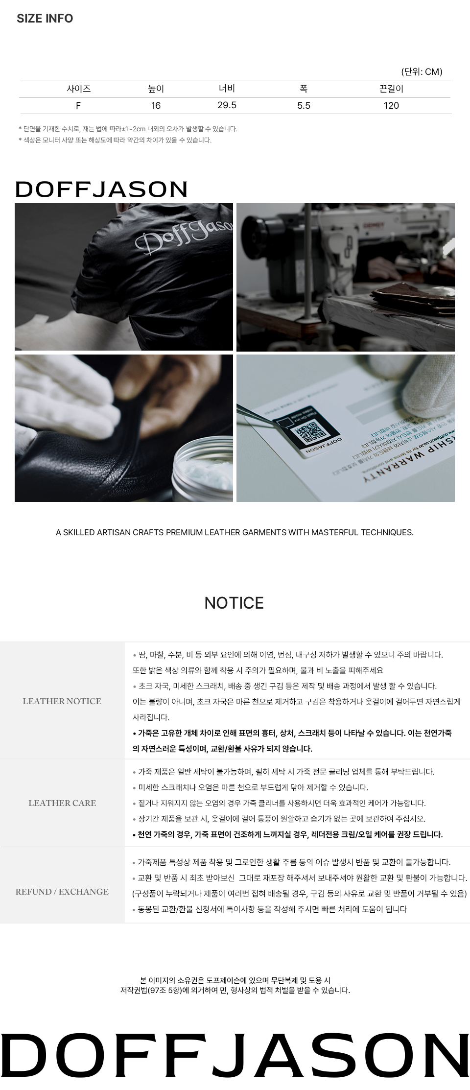 도프제이슨(DOFFJASON)은 가죽이라는 소재에 대한 이해를 기반으로 레더 가먼츠를 중심으로 디자인하는 브랜드입니다. 스타일에 구애받지 않고 오래 입을수록 가치를 더하는 타임리스 디자인을 추구하고, 절제된 디테일과 뛰어난 퀄리티의 아이템을 선보입니다.