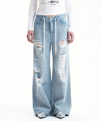 DRAWSTRING DISTRESSED DENIM PANTS LIHGT BLUE