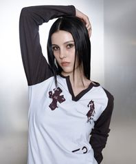 엔틱 크로스 포니 나그랑 배색 브이넥 긴팔 티