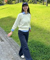 (우먼) 스몰 스퀘어 로고 브이넥 케이블 니트_크림