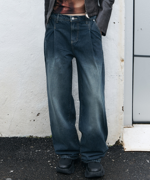 [우먼] 캣워싱 브러쉬 와이드 데님 팬츠 [진청]