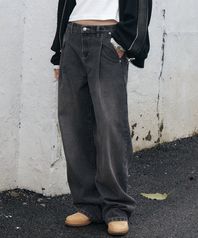 [우먼] 뒷밴딩 원턱 와이드 데님 팬츠[블랙]