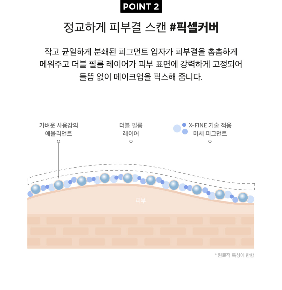정제수, 사이클로펜타실록세인, 티타늄디옥사이드, 다이프로필렌글라이콜, 에칠헥실메톡시신나메이트, 부틸옥틸살리실레이트, 변성알코올, 아이소도데케인, 폴리메틸메타크릴레이트, 다이메티 콘, 나이아신아마이드, 세틸피이지/피피지-10/1다이메티콘, 부틸렌글라이콜, 마그네슘설페이트, 피이 지-10다이메티콘, 비닐다이메티콘/메티콘실세스퀴옥세인크로스폴리머, 프로판다이올, 아크릴레이트 /폴리트라이메틸실록시메타크릴레이트코폴리머, 황색산화철, 알루미늄하이드록사이드, 아크릴레이 트/다이메티콘코폴리머, 다이스테아다이모늄헥토라이트, 트라이메틸실록시실리케이트, 나일론-12, 폴리실리콘-11, 쇠비름추출물, 스테아릭애씨드, 판테놀, 카프릴릴글라이콜, 트라이에톡시카프릴릴실 레인, 적색산화철, 글리세릴카프릴레이트, 바륨설페이트, 실리카, 에틸헥실글리세린, 다이소듐스테아 로일글루타메이트, 토코페롤, 트라이소듐에틸렌다이아민다이석시네이트, 아데노신, 해바라기씨오일, 흑색산화철, 라우레스-4, 1,2-헥산다이올, 우유단백질추출물, 하이알루로닉애씨드, 하이드롤라이즈드 하이알루로닉애씨드, 소듐하이알루로네이트, 펜타에리스리틸테트라-다이-t-부틸하이드록시하이드 로신나메이트, 트라이메틸실록시실리케이트/다이메티콘올크로스폴리머, 아세틸헥사펩타이드-8, 아 세틸옥타펩타이드-3, 카퍼트라이펩타이드-1, 팔미토일펜타펩타이드-4, 팔미토일테트라펩타이드-7, 팔미토일트라이펩타이드-1, 트라이펩타이드-1, 트라이펩타이드-2, 트라이펩타이드-3