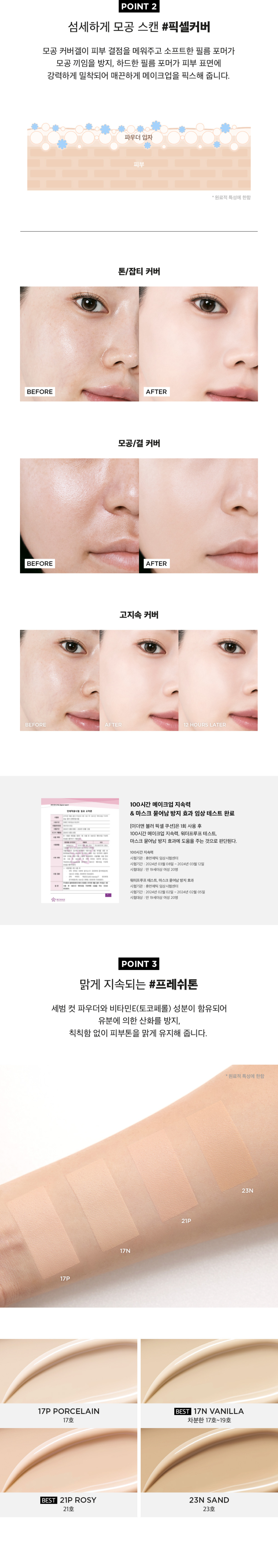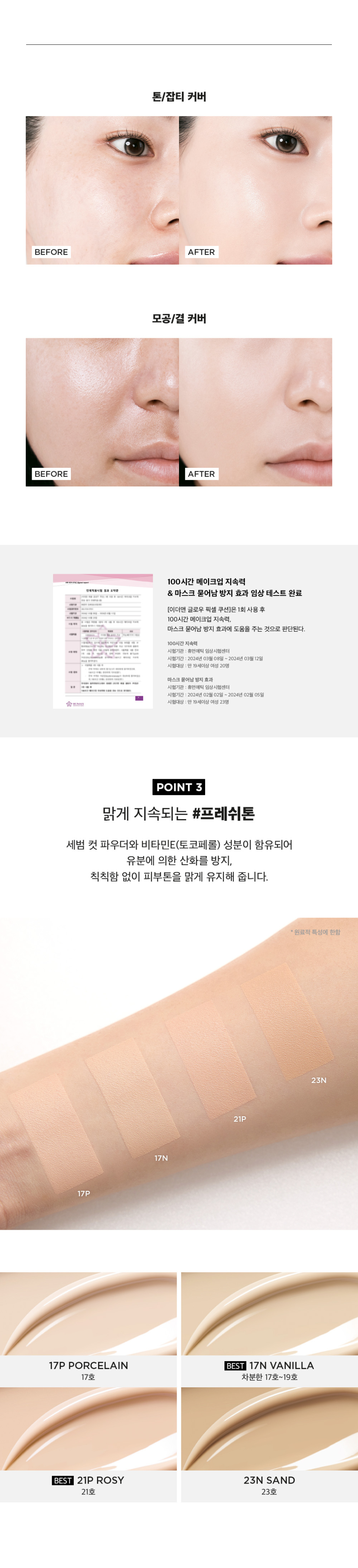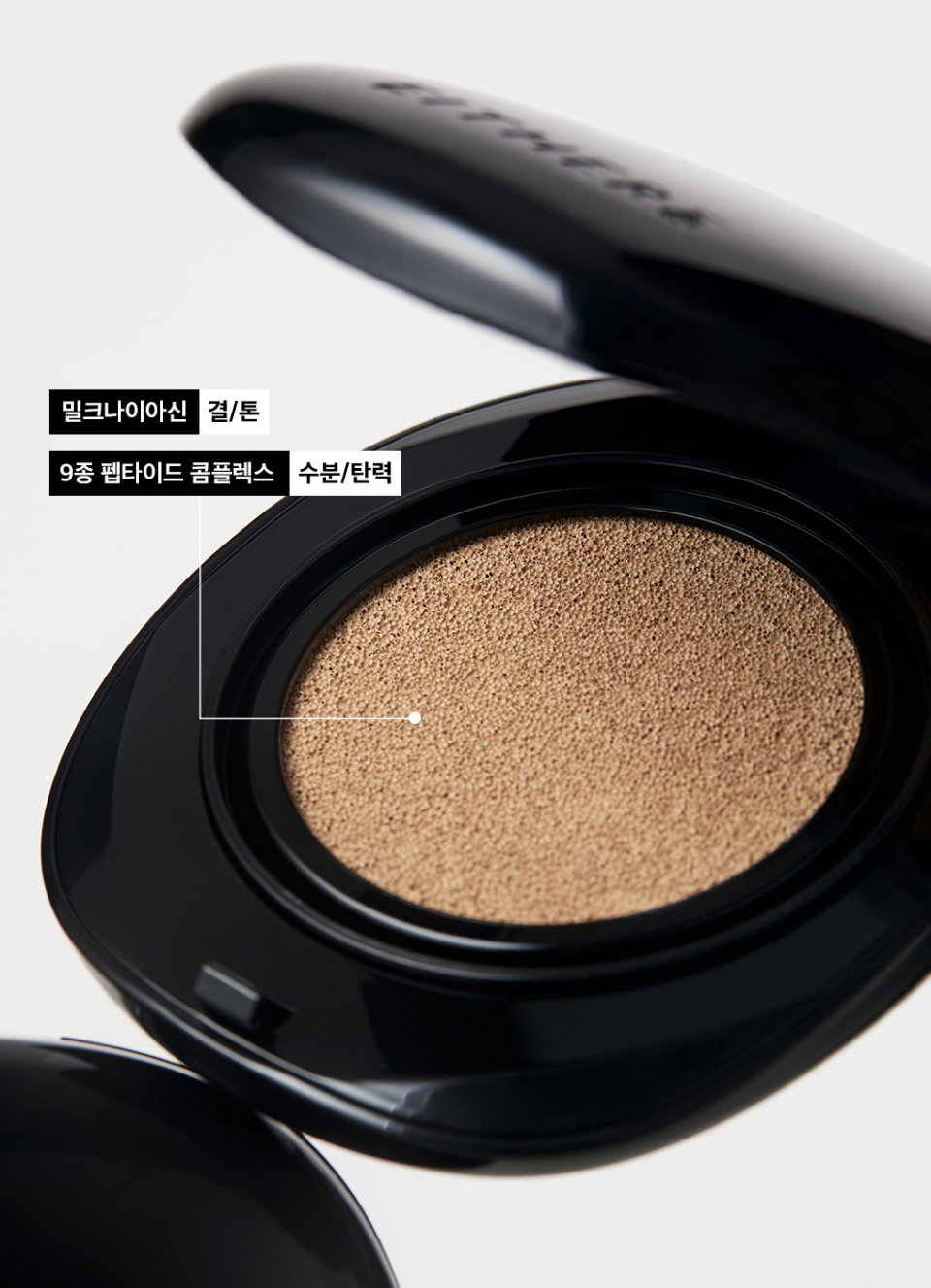 정제수, 사이클로펜타실록세인, 티타늄디옥사이드, 다이프로필렌글라이콜, 에칠헥실메톡시신나메이트, 부틸옥틸살리실레이트, 변성알코올, 아이소도데케인, 폴리메틸메타크릴레이트, 다이메티콘, 나이아신아마이드, 세틸피이지/피피지-10/1다이메티콘, 부틸렌글라이콜, 마그네슘설페이트, 피이지- 10다이메티콘, 비닐다이메티콘/메티콘실세스퀴옥세인크로스폴리머, 황색산화철, 프로판다이올, 아크 릴레이트/폴리트라이메틸실록시메타크릴레이트코폴리머, 알루미늄하이드록사이드, 아크릴레이트/ 다이메티콘코폴리머, 다이스테아다이모늄헥토라이트, 트라이메틸실록시실리케이트, 나일론-12, 폴리 실리콘-11, 쇠비름추출물, 스테아릭애씨드, 판테놀, 카프릴릴글라이콜, 트라이에톡시카프릴릴실레인, 적색산화철, 글리세릴카프릴레이트, 바륨설페이트, 실리카, 에틸헥실글리세린, 다이소듐스테아로일글 루타메이트, 토코페롤, 트라이소듐에틸렌다이아민다이석시네이트, 아데노신, 해바라기씨오일, 흑색산 화철, 라우레스-4, 1,2-헥산다이올, 우유단백질추출물, 하이알루로닉애씨드, 하이드롤라이즈드하이알 루로닉애씨드, 소듐하이알루로네이트, 펜타에리스리틸테트라-다이-t-부틸하이드록시하이드로신나메 이트, 트라이메틸실록시실리케이트/다이메티콘올크로스폴리머, 트라이펩타이드-3, 아세틸헥사펩타 이드-8, 아세틸옥타펩타이드-3, 카퍼트라이펩타이드-1, 팔미토일펜타펩타이드-4, 팔미토일테트라 펩타이드-7, 팔미토일트라이펩타이드-1, 트라이펩타이드-1, 트라이펩타이드-2