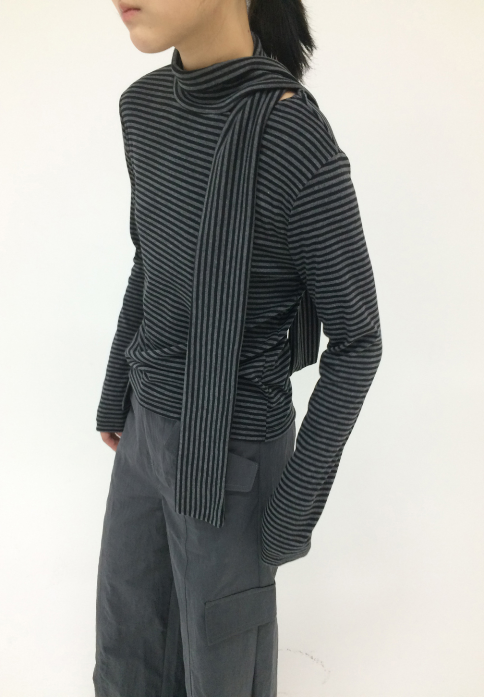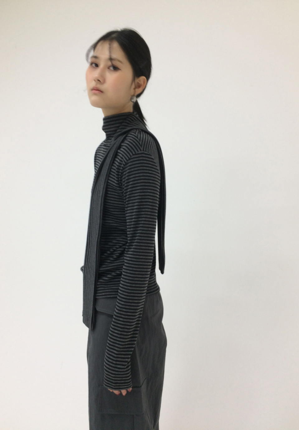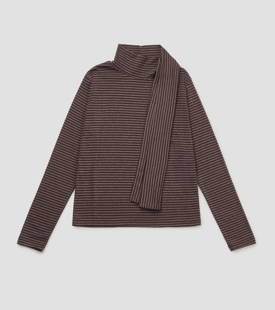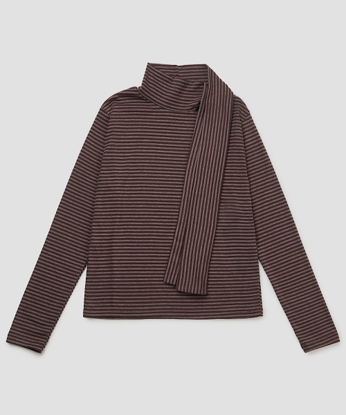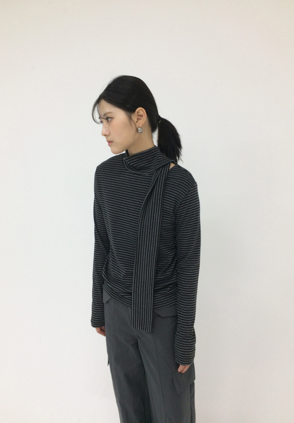 네크라인에 자연스럽게 이어지는 스카프 디테일이 특징적인 롱슬리브 티셔츠입니다.