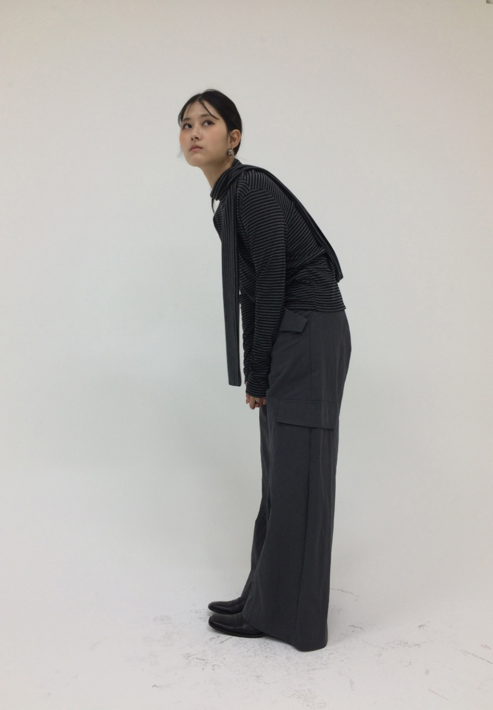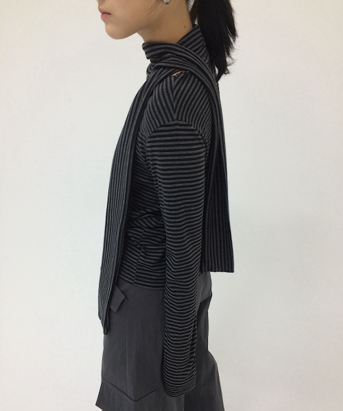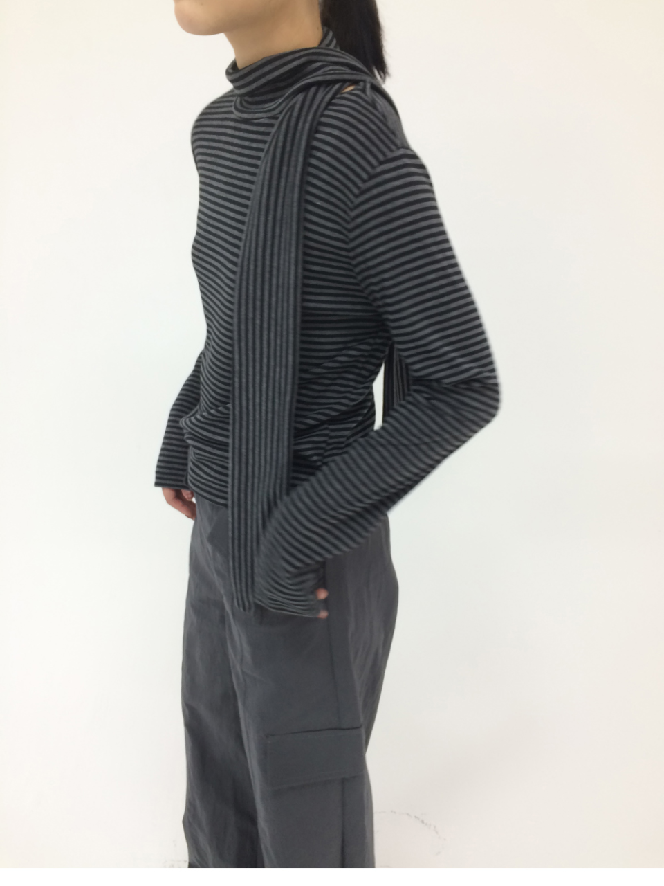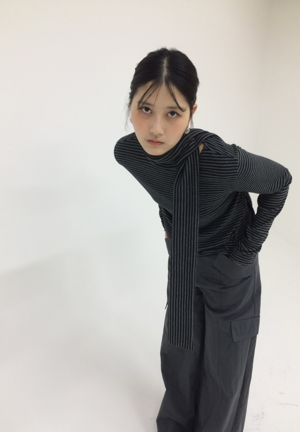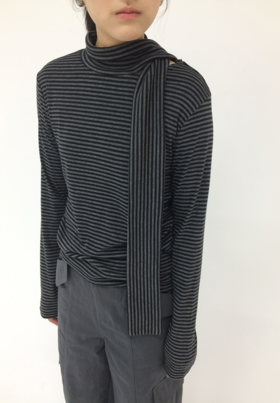 네크라인에 자연스럽게 이어지는 스카프 디테일이 특징적인 롱슬리브 티셔츠입니다.