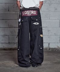 바이커 카고 포켓 와이드 면팬츠 블랙